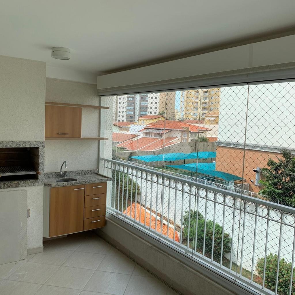 Ampla varanda gourmet com fechamento em vidro, ideal para reunir amigos e familiares.