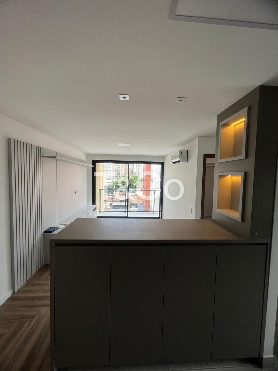 O apto tem 51 mts, bem distribuído, contendo 1 dormitório com bons armários, painel para TV, ar condicionado e porta para sacada.