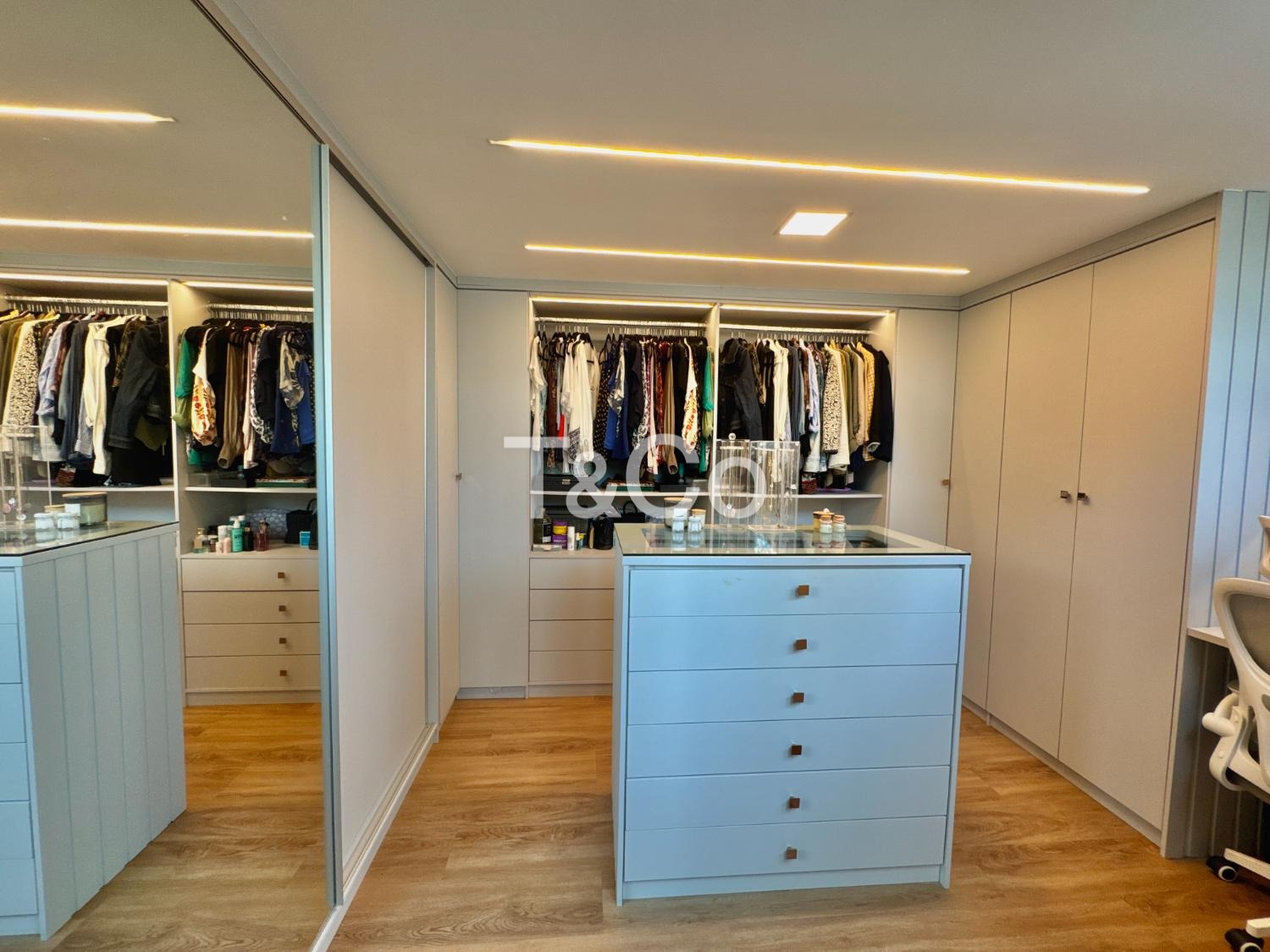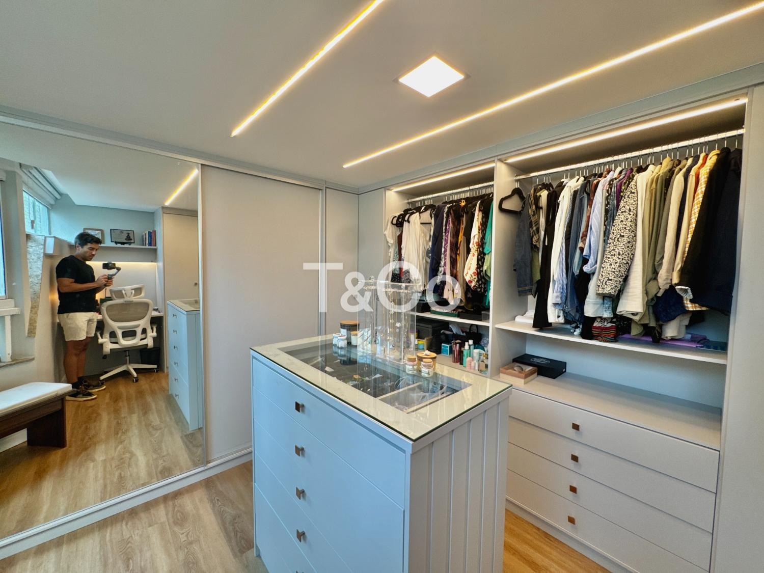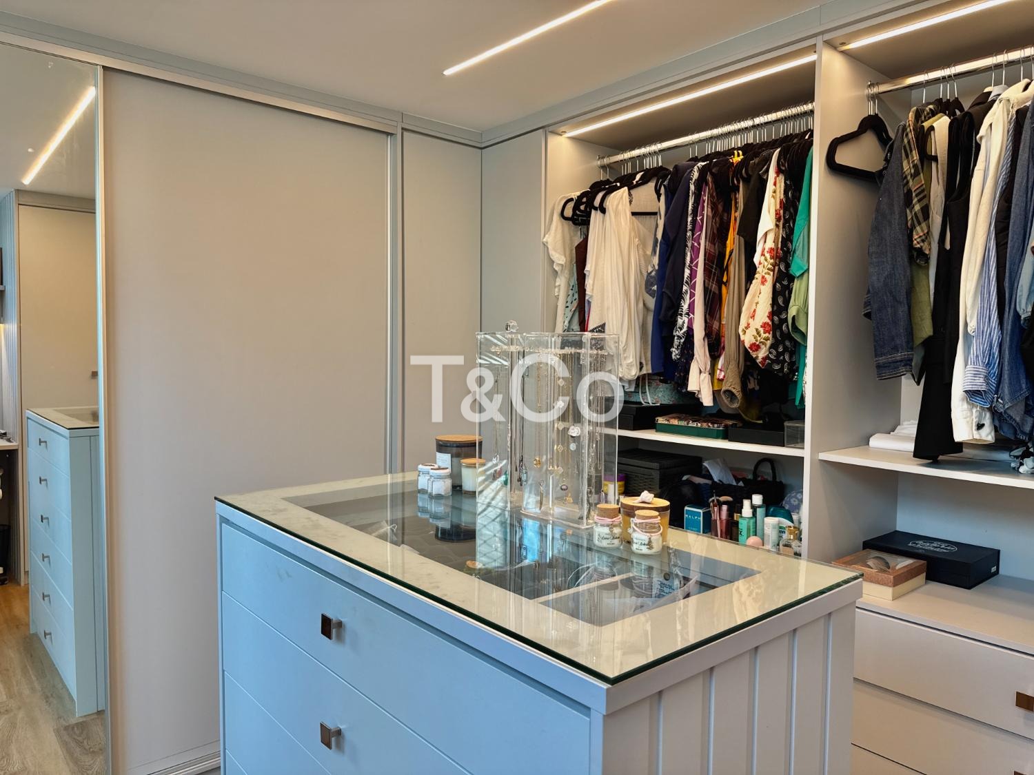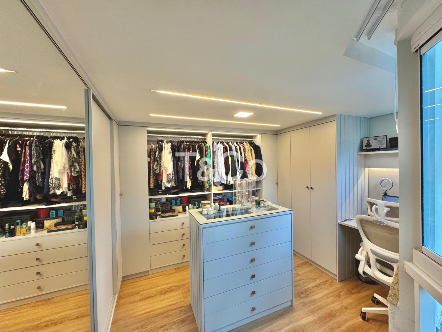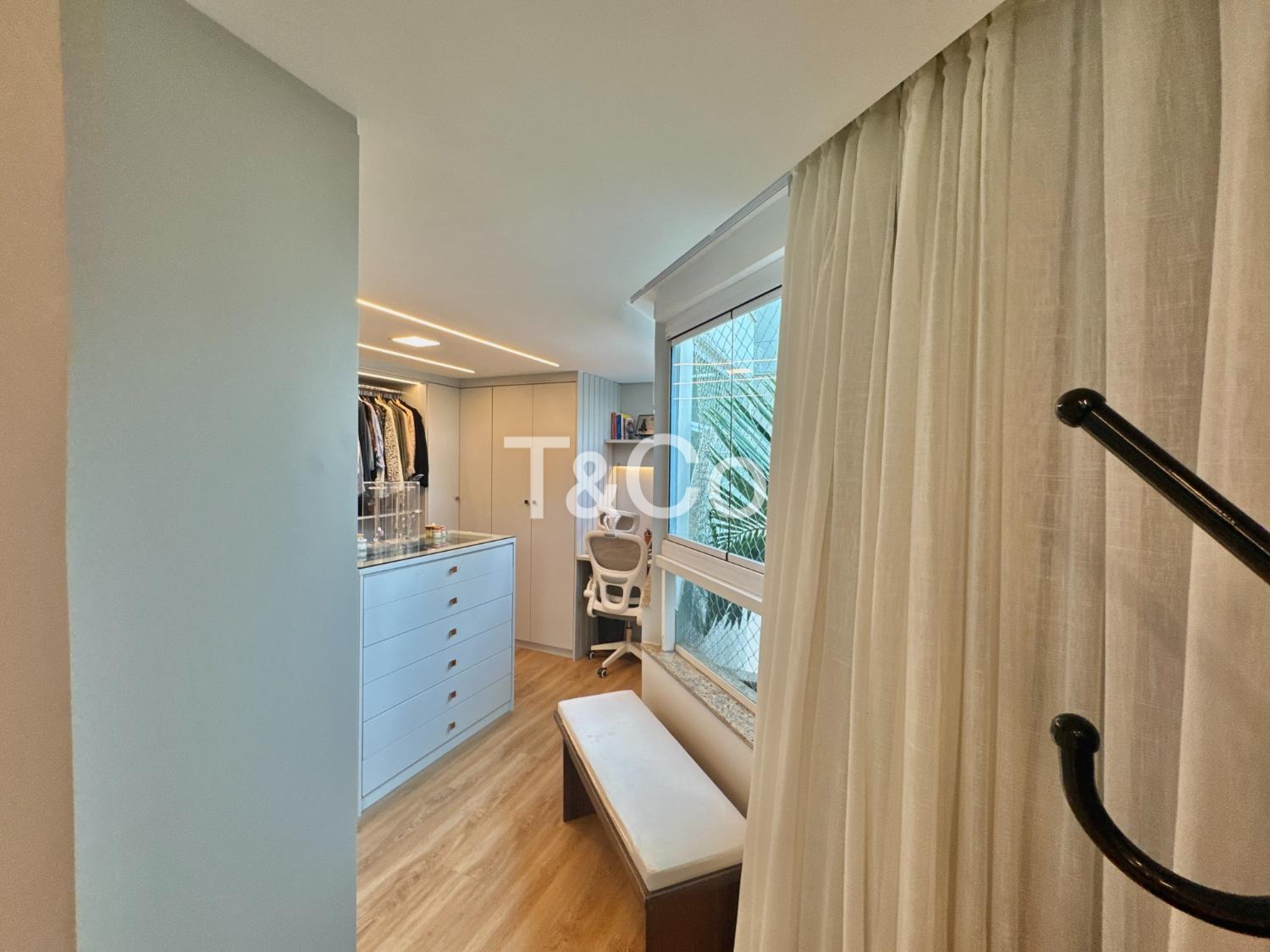 O imóvel possui 4 quartos, sendo 3 suítes — uma delas uma suíte master completamente reformada, com armários planejados e um super closet. A quarta suíte, anexa ao escritório, oferece flexibilidade para um espaço de trabalho ou para receber hóspedes. A automação completa por Alexa e os móveis planejados na cozinha, quartos e banheiros adicionam praticidade e sofisticação.