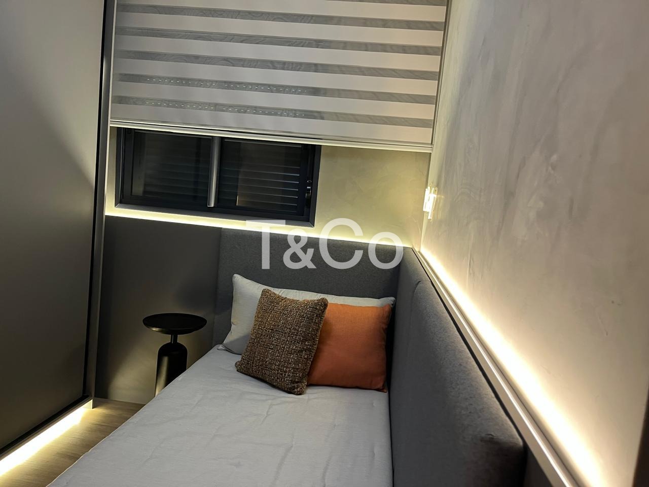 Acabamentos de alto padrão: porcelanato em grandes formatos e persianas integradas nos dormitórios