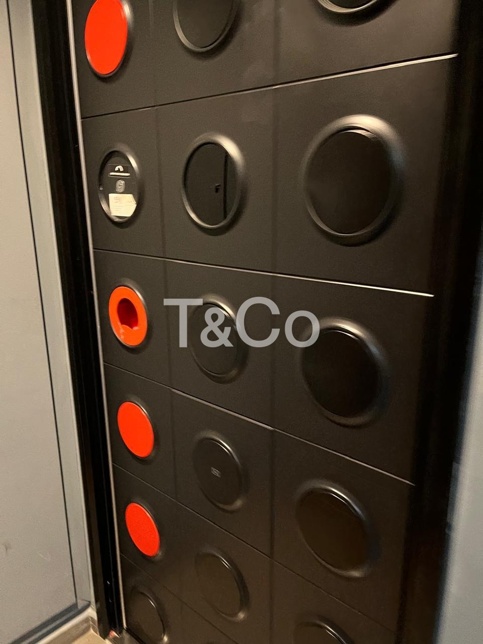 No corredor, armários grandes em frente ao lavabo — ótimo espaço de armazenamento.