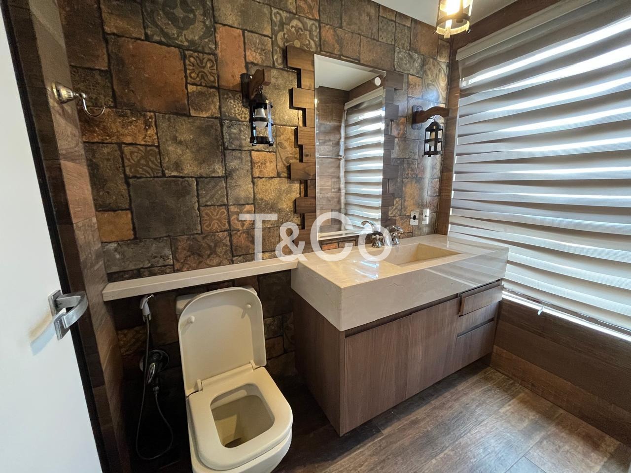 Banheiro da suíte com armário embutido, em estilo chalé de madeira.
