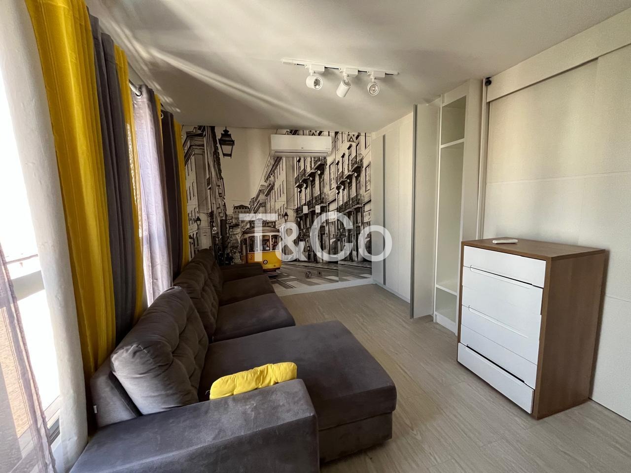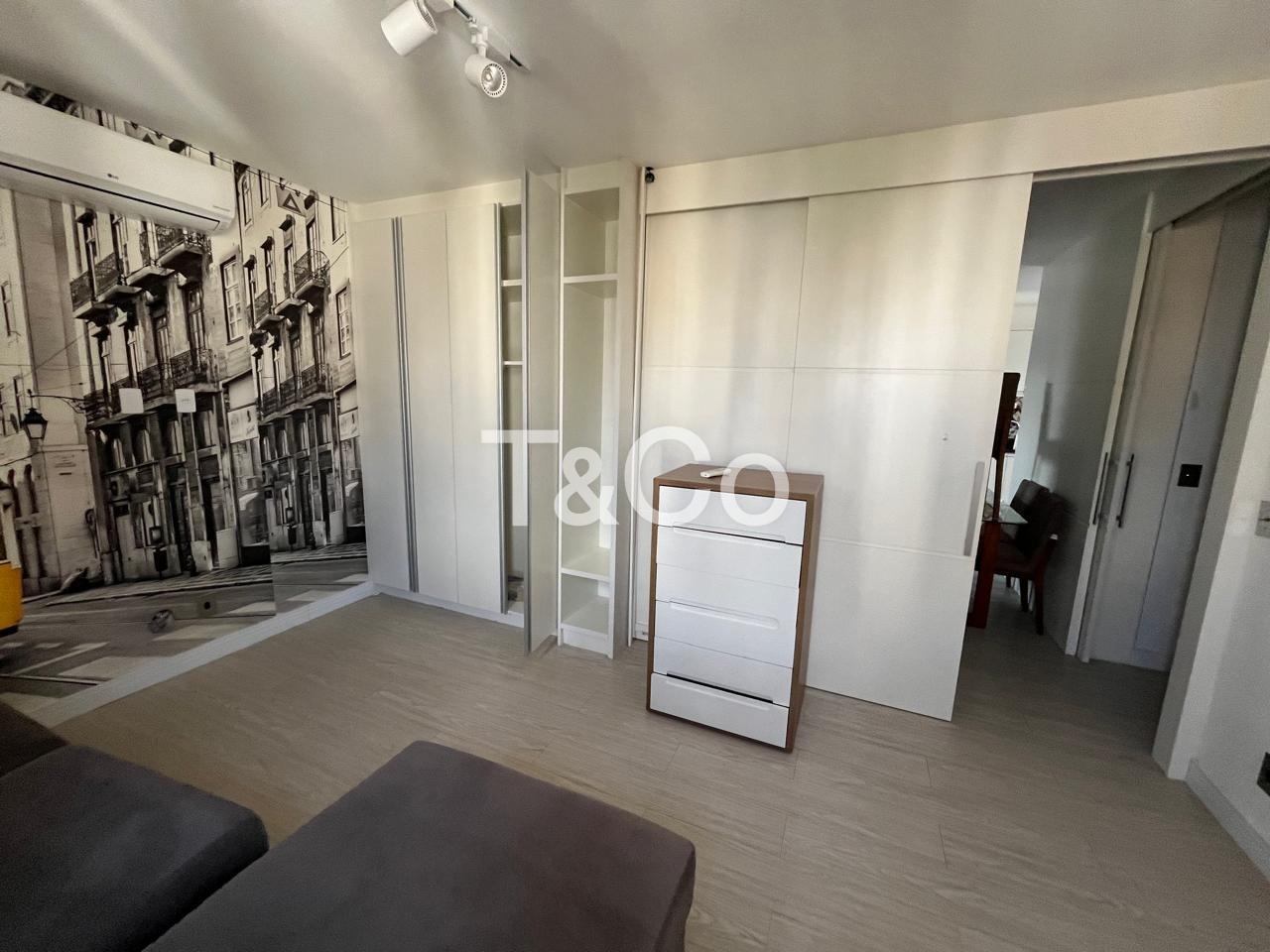 Sala ampla, com sofá-cama, ideal para receber visitas. Também tem um armário, reforçando o uso como quarto de hóspedes.