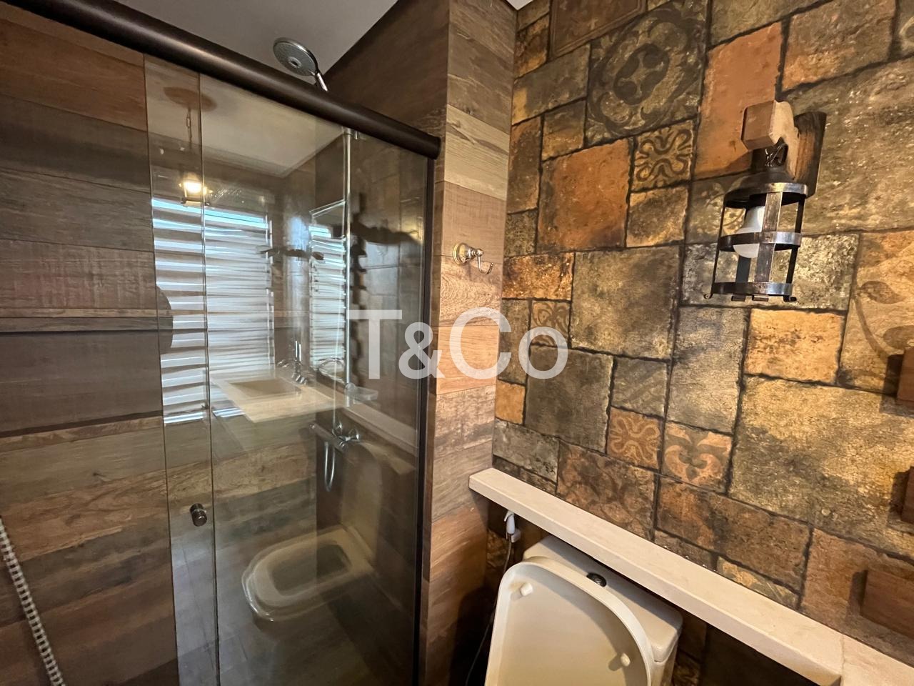 Banheiro da suíte: atmosfera de chalé de madeira, acolhedora e rústica.
