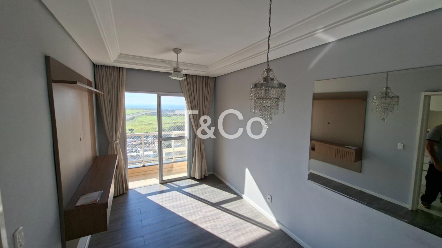 ● Sala de estar/jantar com estante, painel para TV, ventilador, cortina sob medida e varanda com vista privilegiada