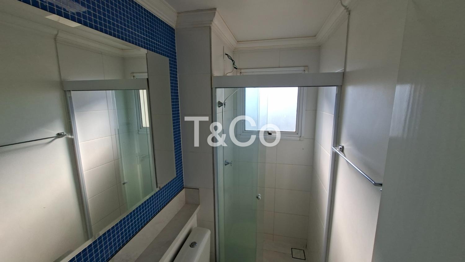 ● Banheiro com box em vidro temperado e espelho