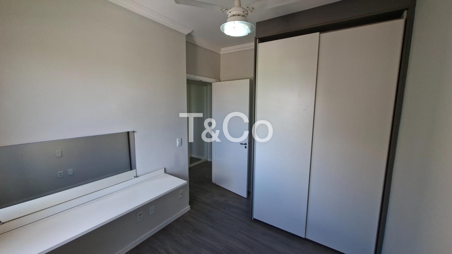 ● 2 dormitórios equipados com armários e ventiladores, sendo um com cabeceira de cama de casal e outro com bancada de trabalho