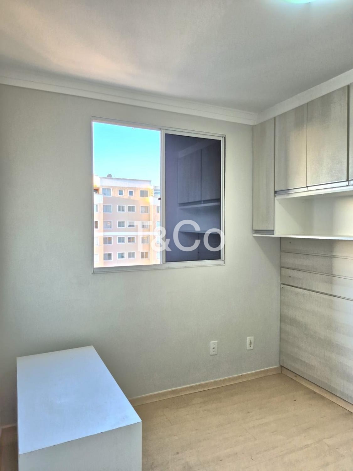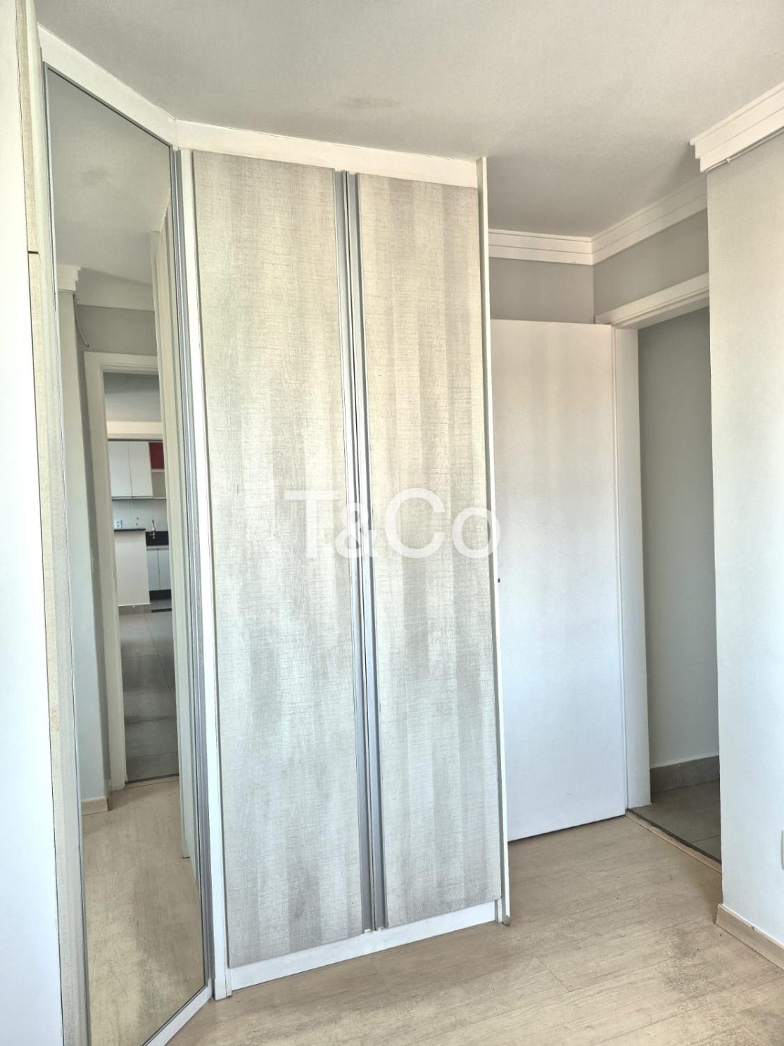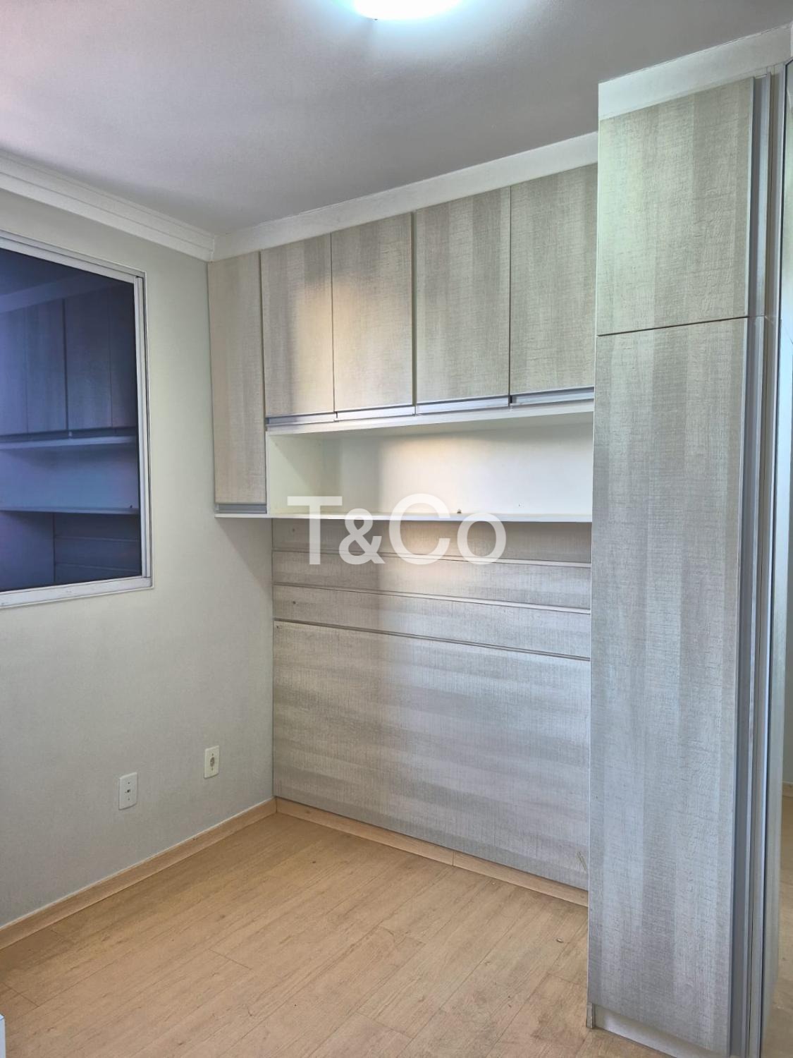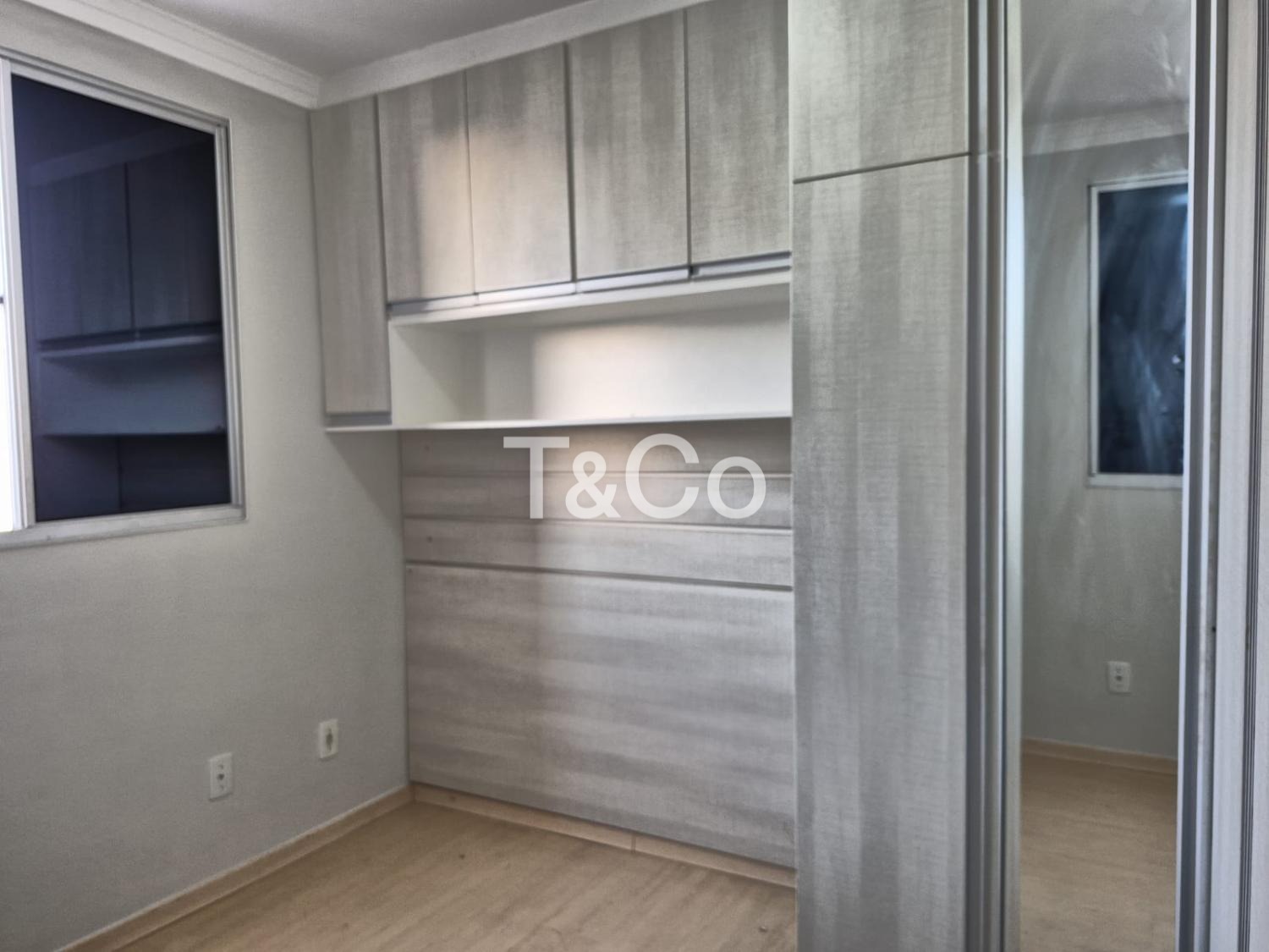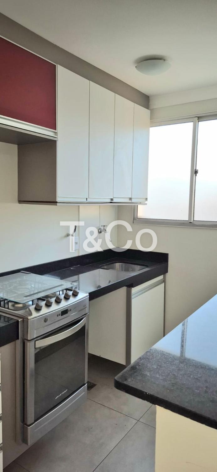 Sendo 2 dormitórios com armários planejados, cozinha com armários, sala, banheiro social, com box blindex, gabinete e espelho.