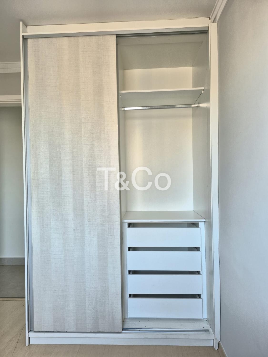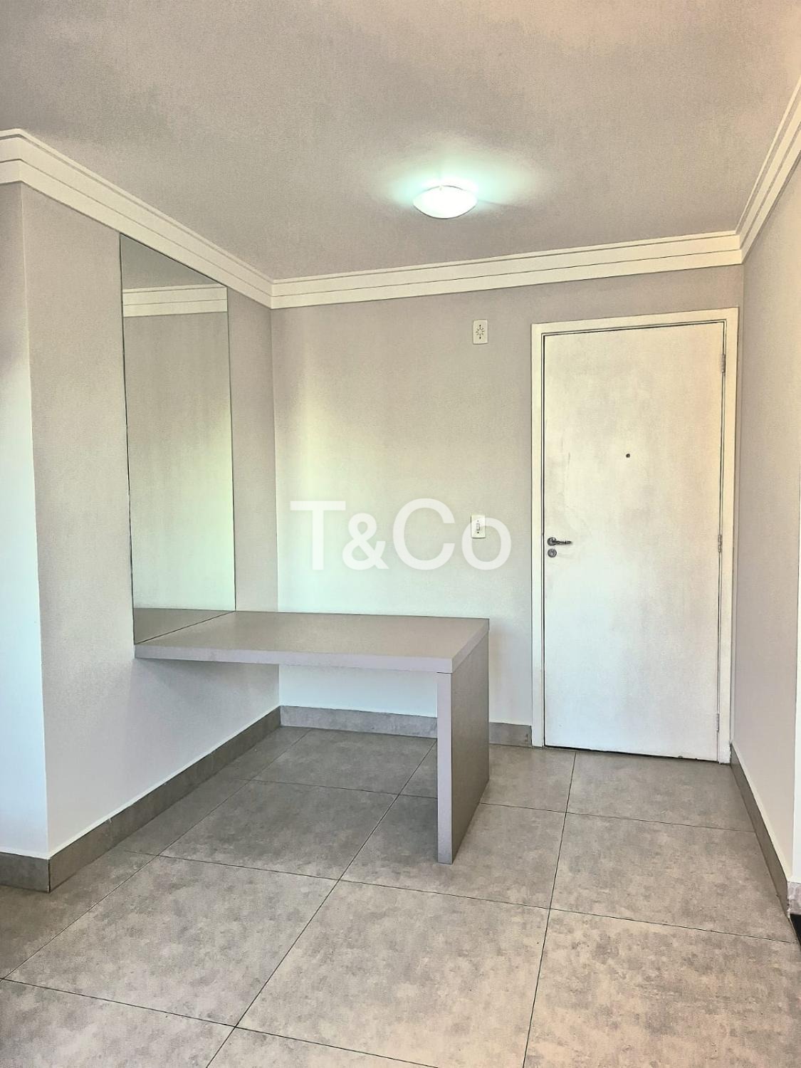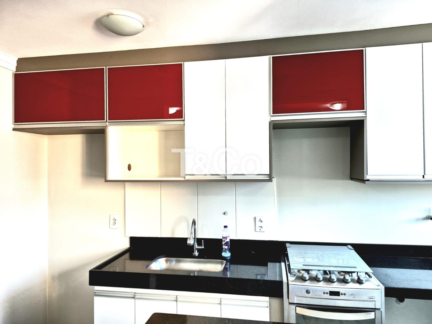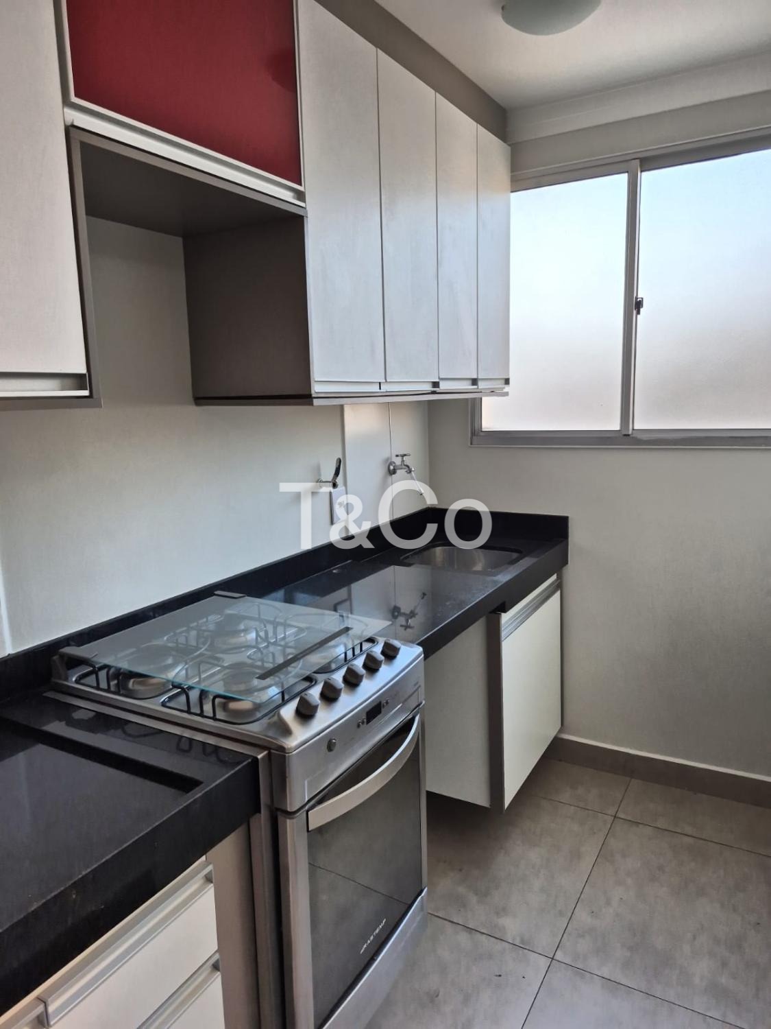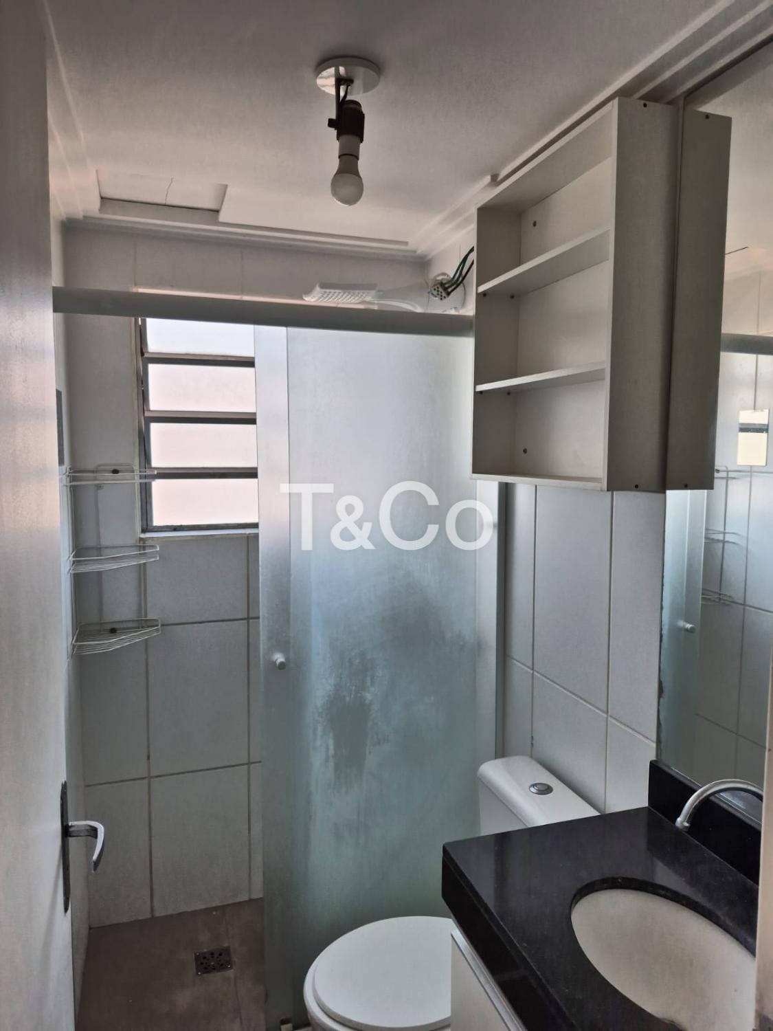 Sendo 2 dormitórios com armários planejados, cozinha com armários, sala, banheiro social, com box blindex, gabinete e espelho.