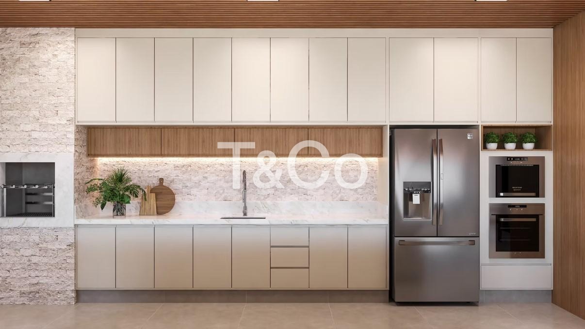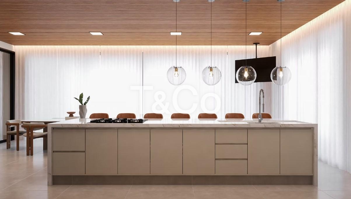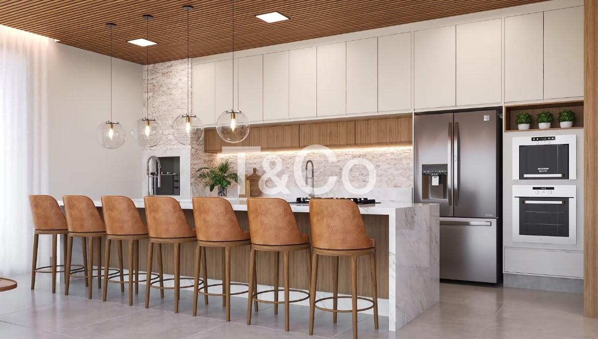 - Cozinha equipada com armários planejados, coifa, cooktop e forno elétrico