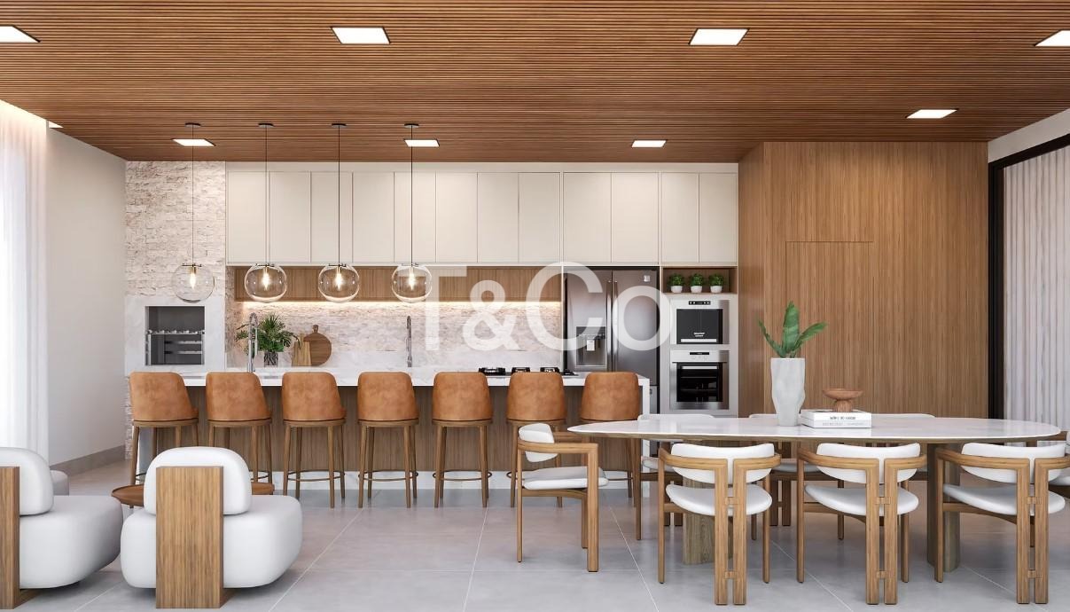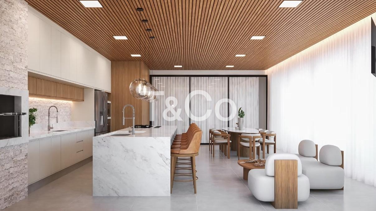 - Sala ampla com pé direito duplo, integrada à cozinha americana