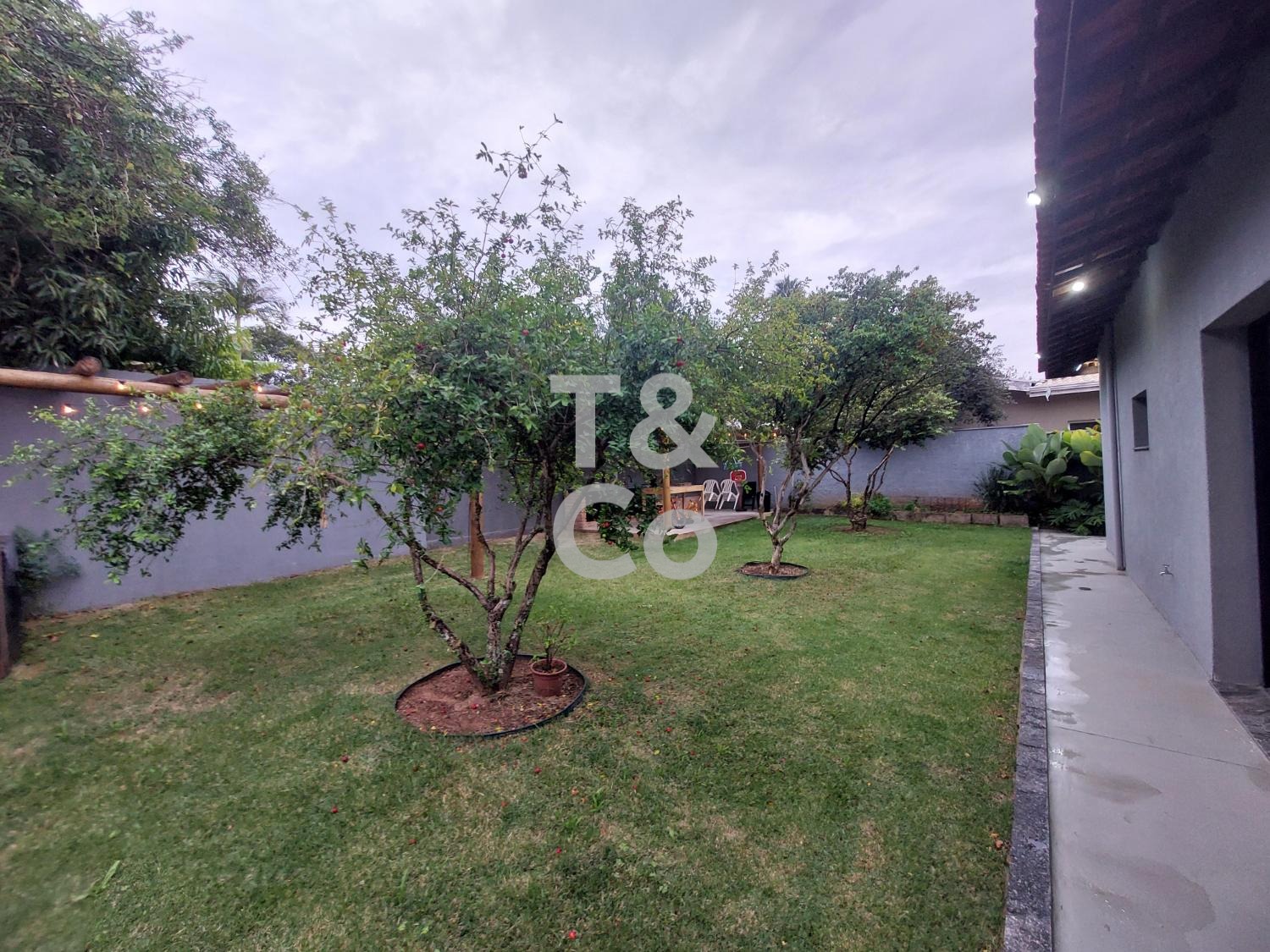 Quintal gramado com árvores frutíferas e pergolado, ideal para área gourmet.