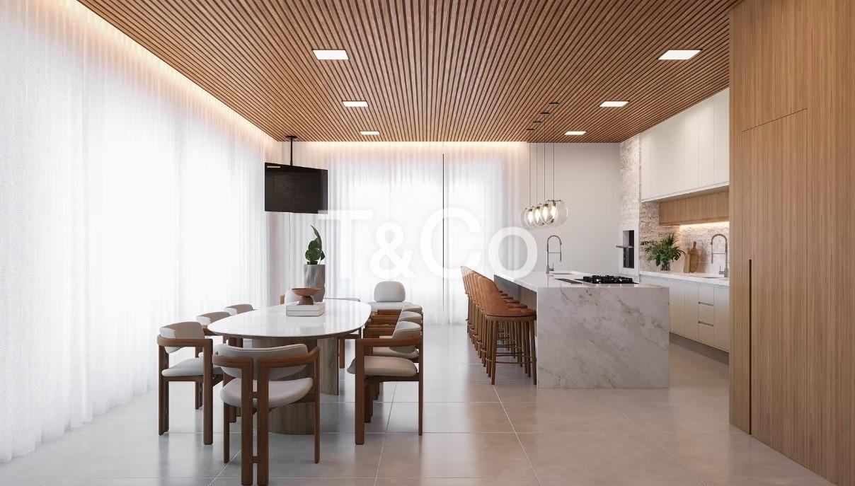 • Sala ampla com pé direito duplo, integrada à cozinha americana