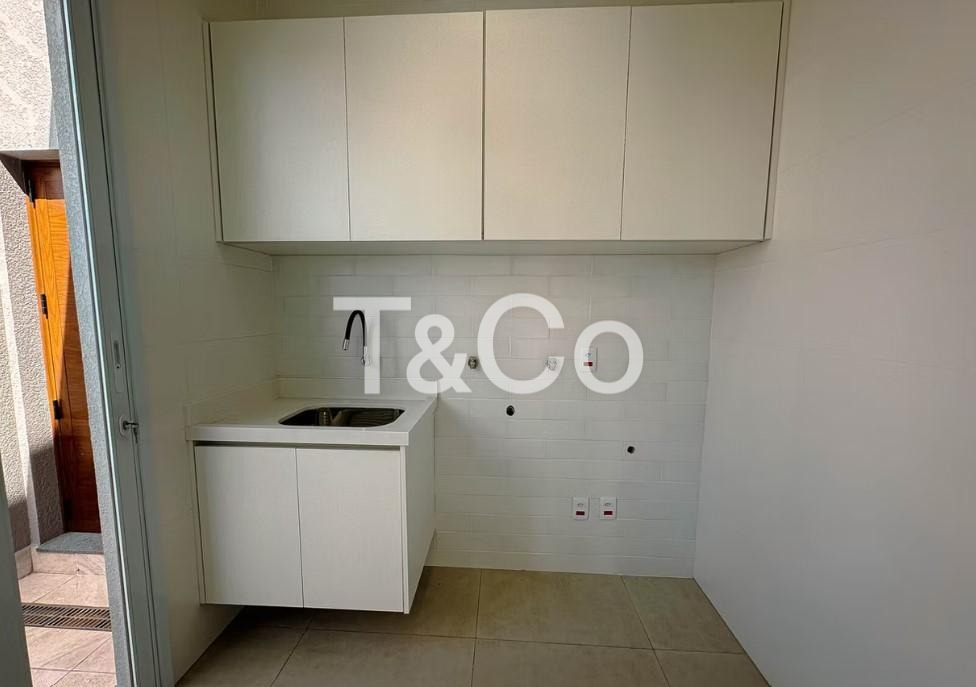 - Cozinha equipada com armários, cooktop, forno e coifa