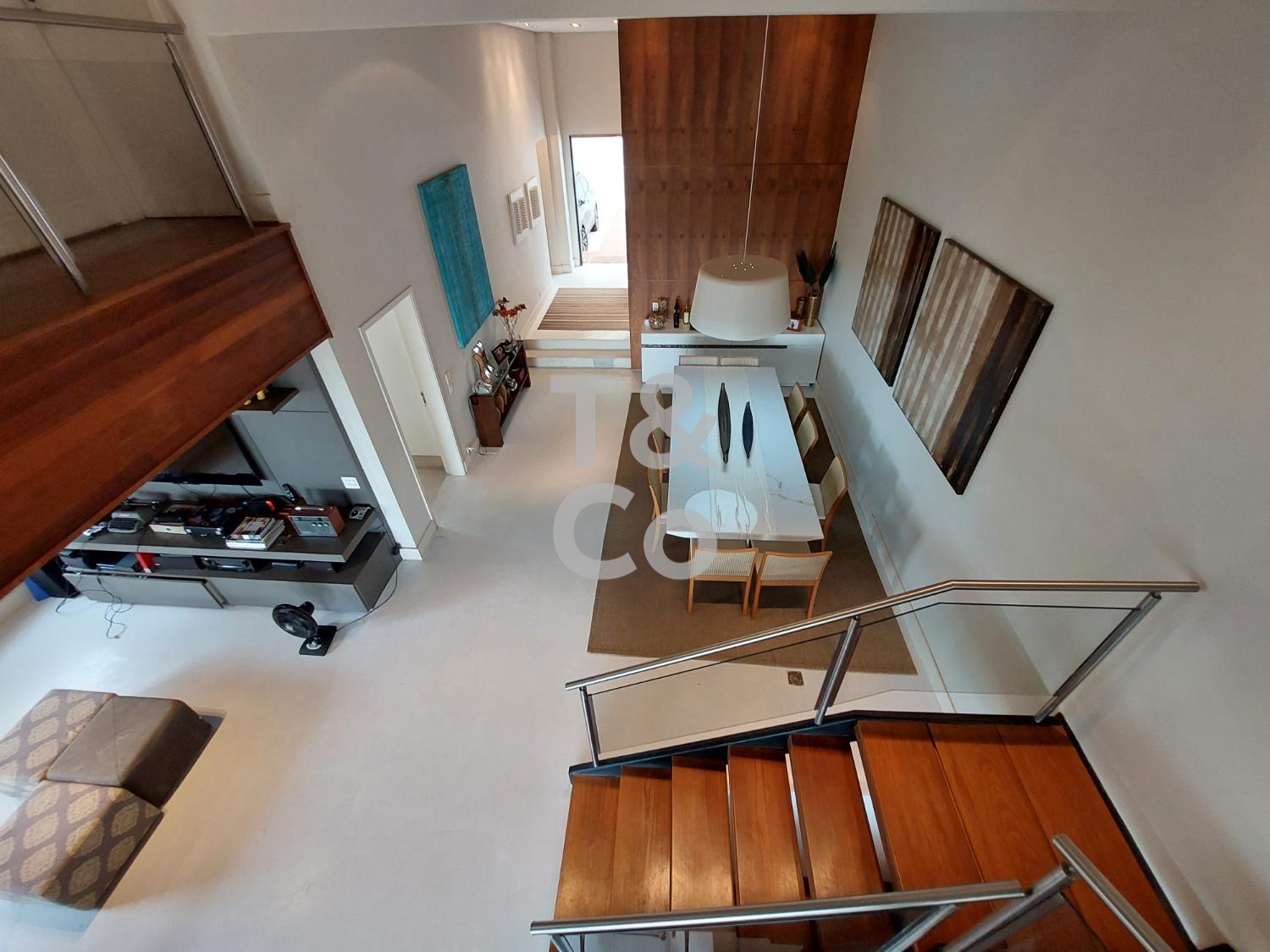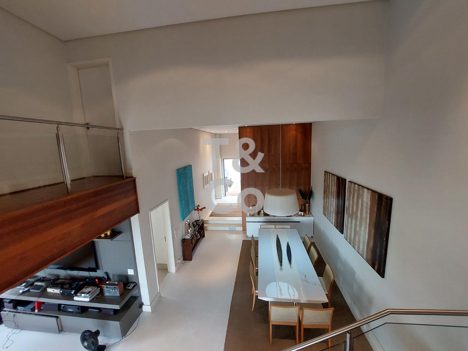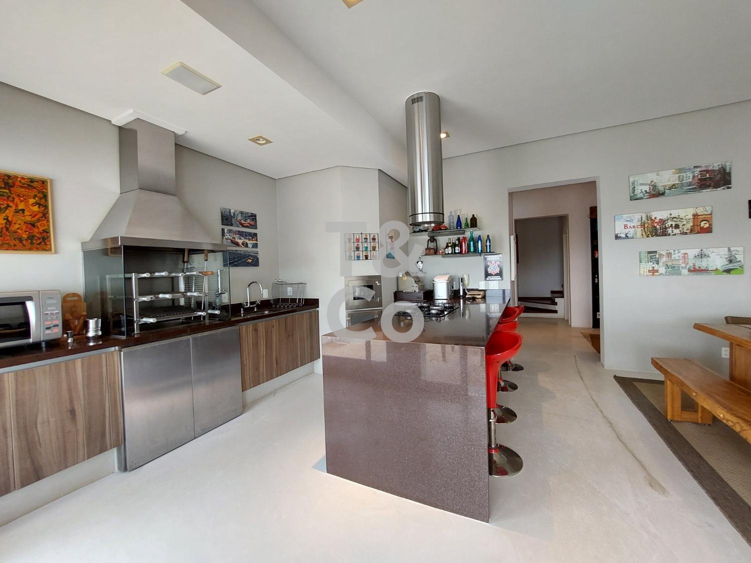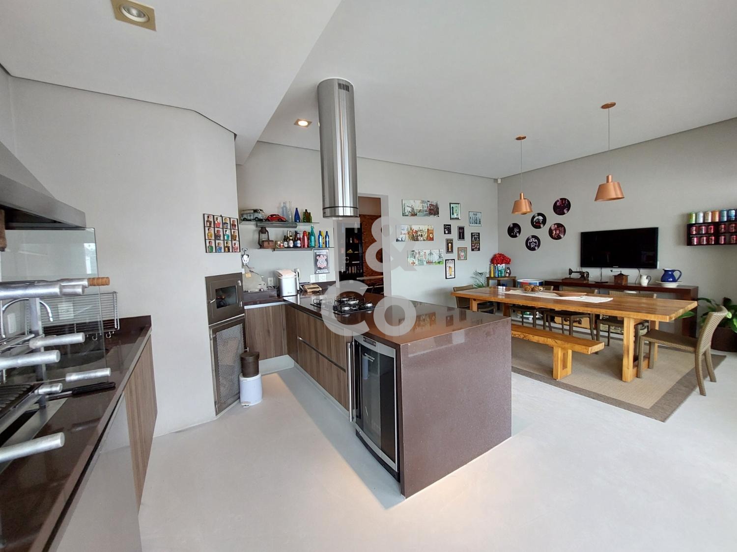 Esta casa surpreende pelo design elegante e pelos acabamentos de alto padrão. O living com pé-direito duplo integra vários ambientes com sofisticação. A cozinha Kitchens, equipada com bancada em Corian e armários Kitchens e Ornare, oferece funcionalidade e requinte.