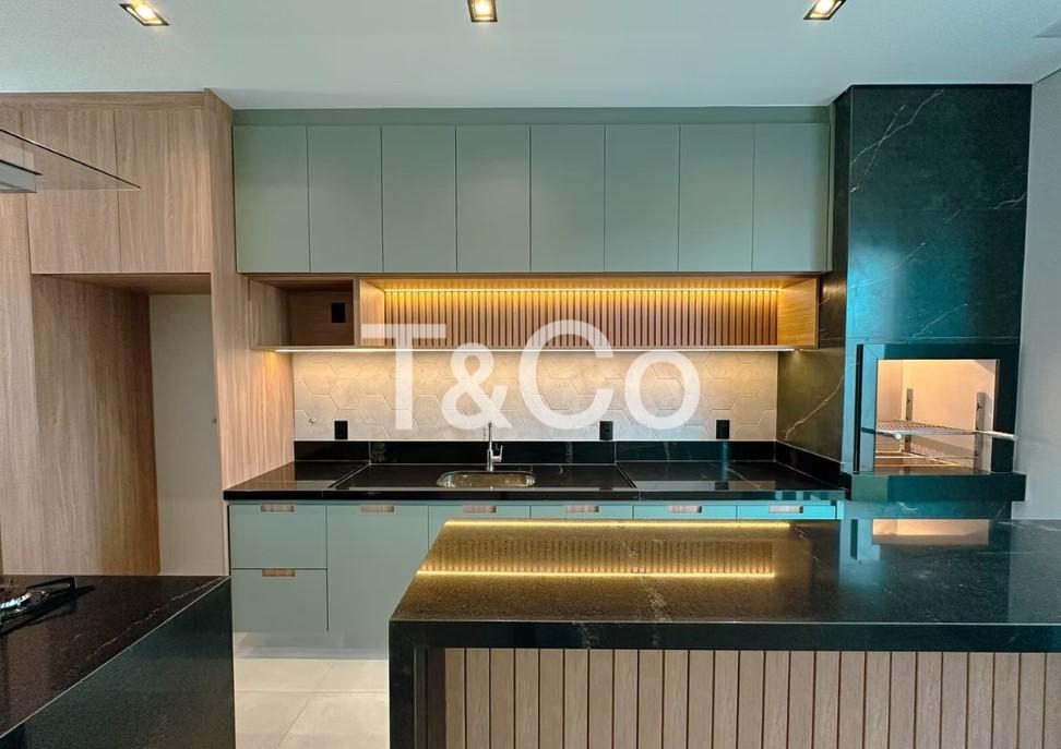 ● Cozinha integrada à área gourmet equipada com forno, cooktop e coifa