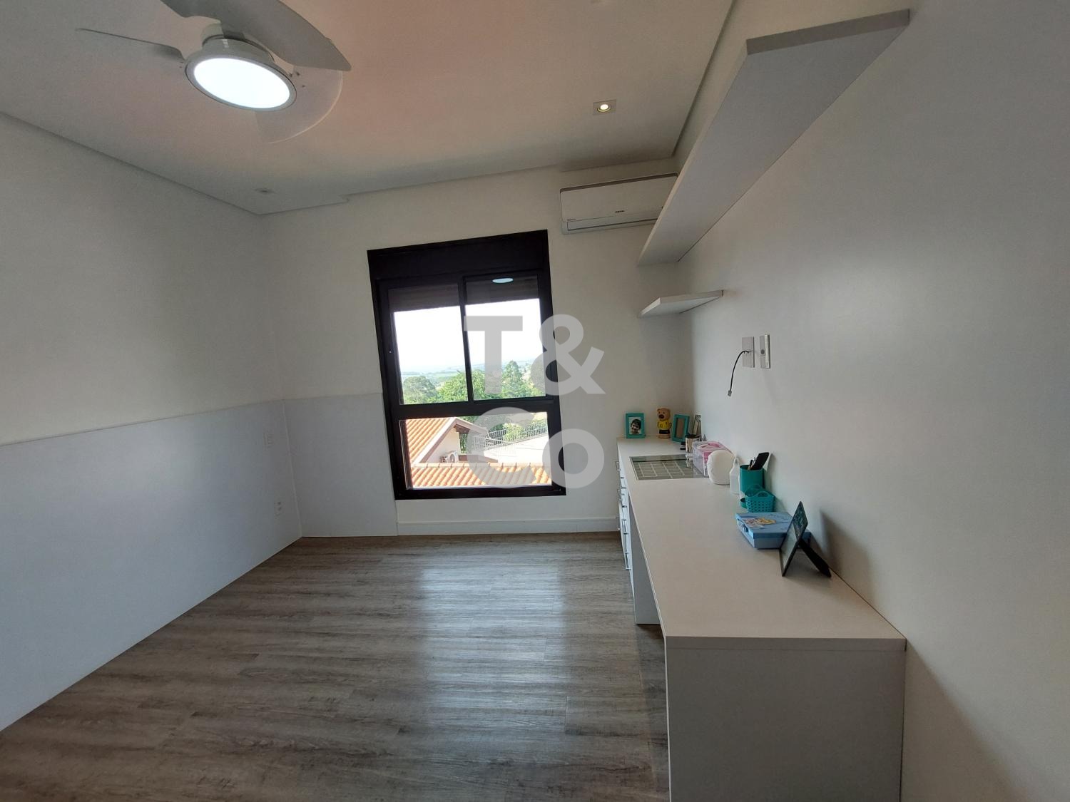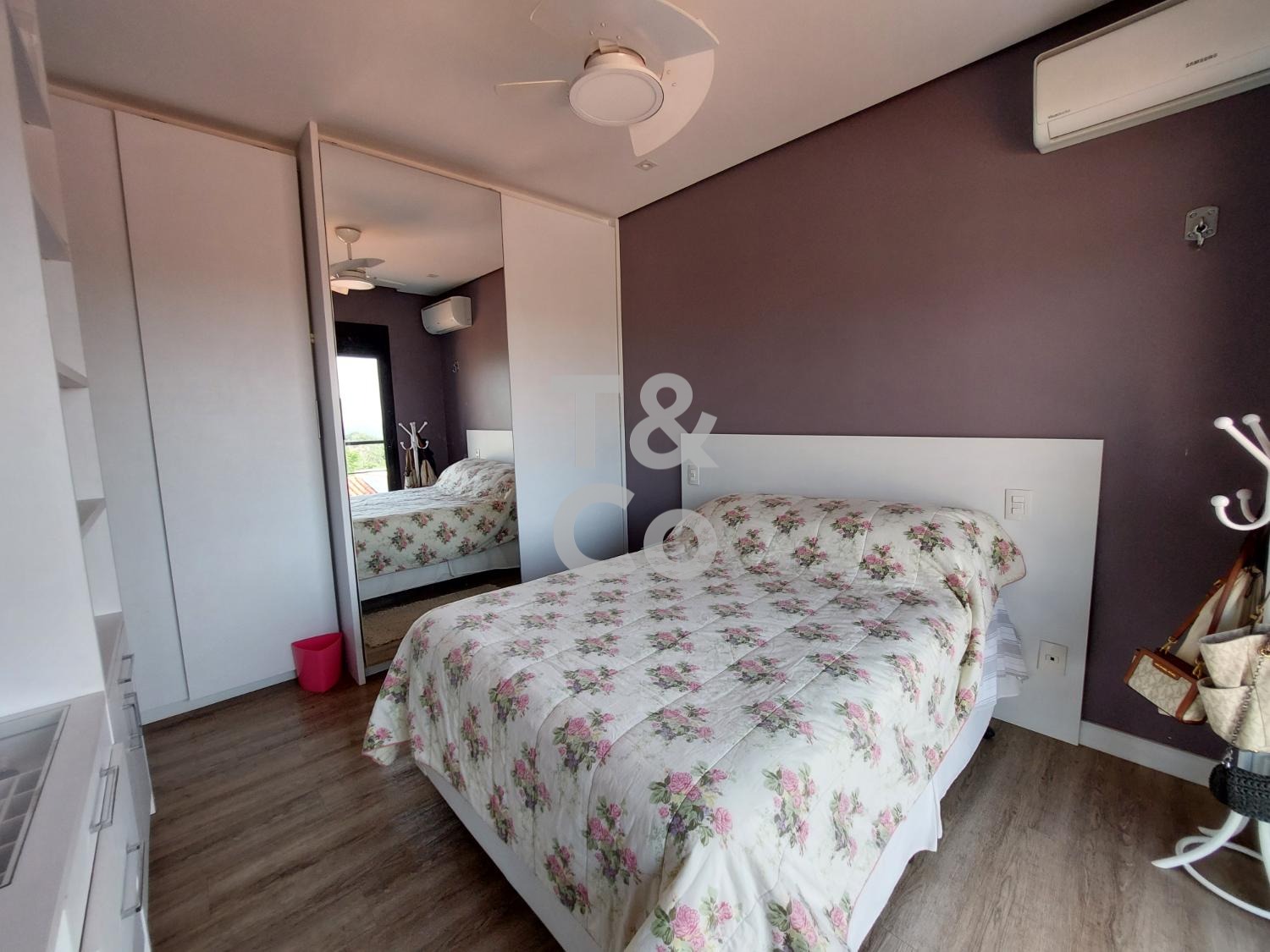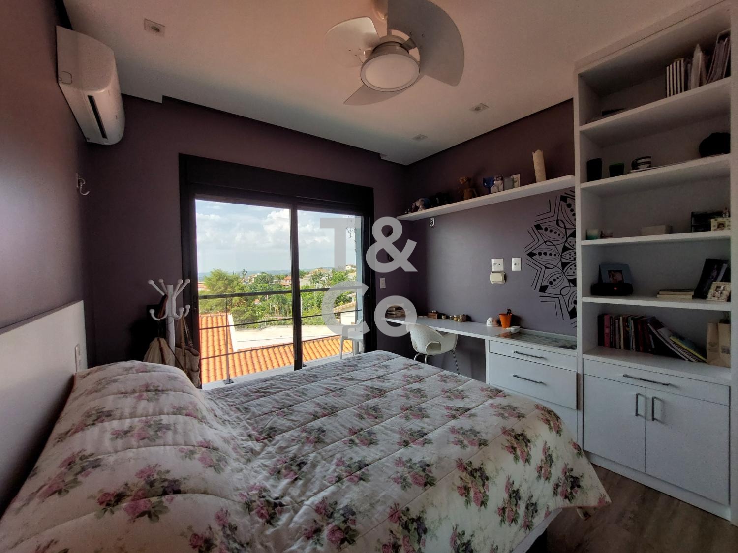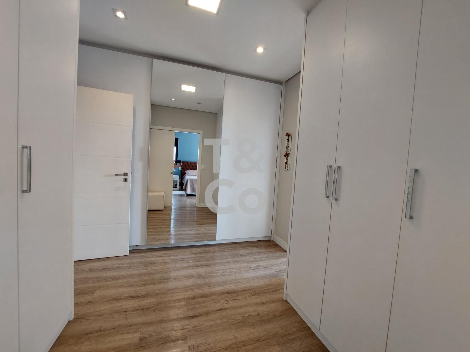 No pavimento superior estão os espaços íntimos: a suíte máster conta com escritório, closet e sacada com vista permanente para a mata. Há ainda uma segunda suíte com sacada e mais dois dormitórios atendidos por um banheiro social. Todos os dormitórios possuem persianas motorizadas e aparelhos de ar-condicionado. O imóvel dispõe de aquecimento solar e é rico em armários planejados, oferecendo praticidade e conforto no dia a dia.