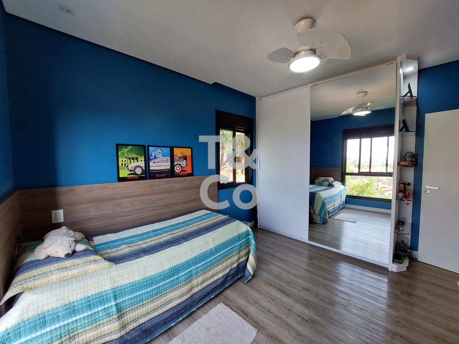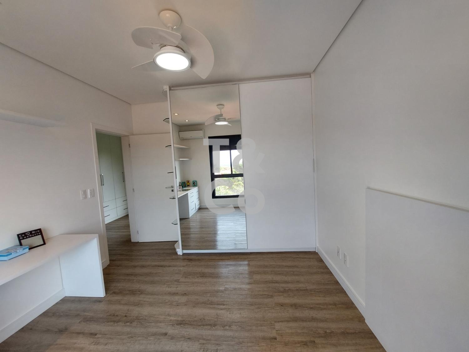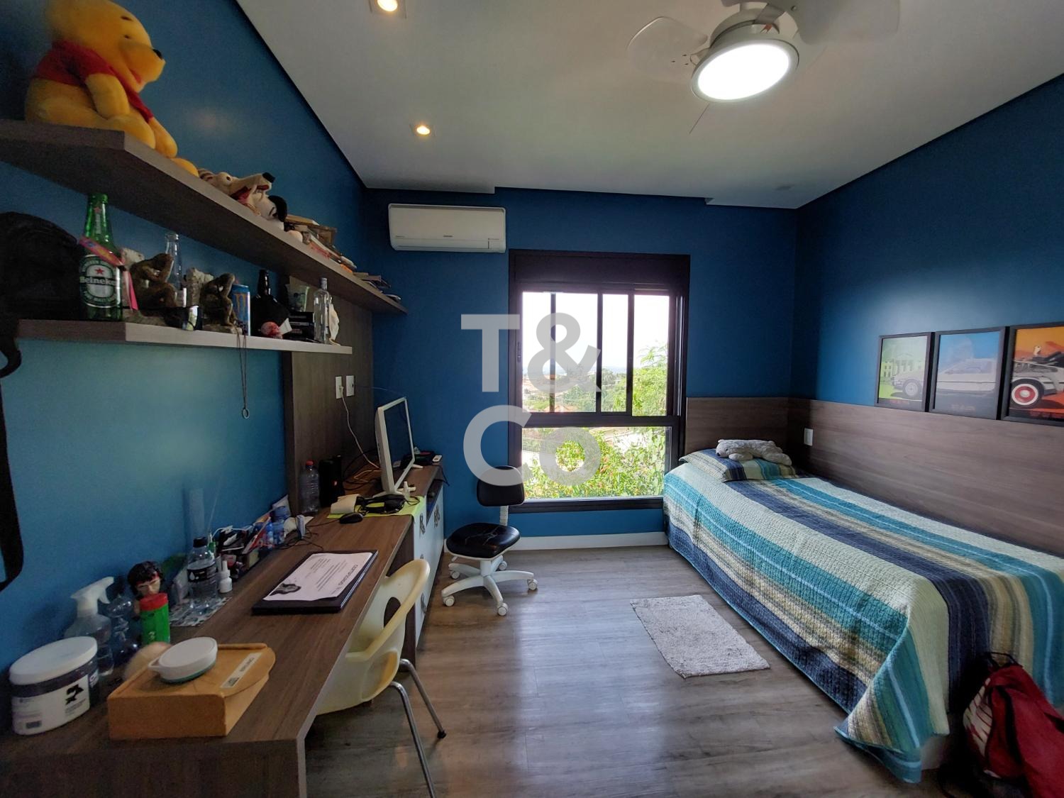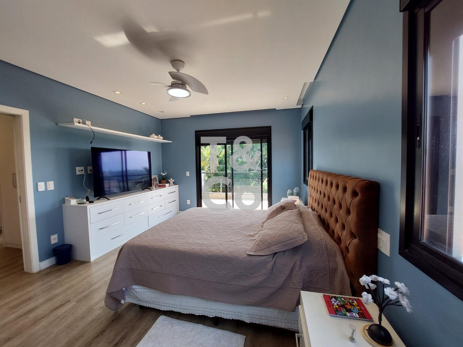 No pavimento superior estão os espaços íntimos: a suíte máster conta com escritório, closet e sacada com vista permanente para a mata. Há ainda uma segunda suíte com sacada e mais dois dormitórios atendidos por um banheiro social. Todos os dormitórios possuem persianas motorizadas e aparelhos de ar-condicionado. O imóvel dispõe de aquecimento solar e é rico em armários planejados, oferecendo praticidade e conforto no dia a dia.