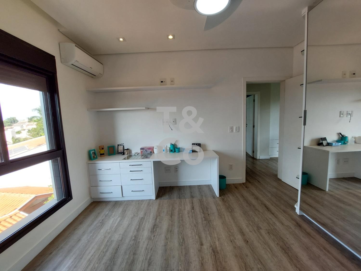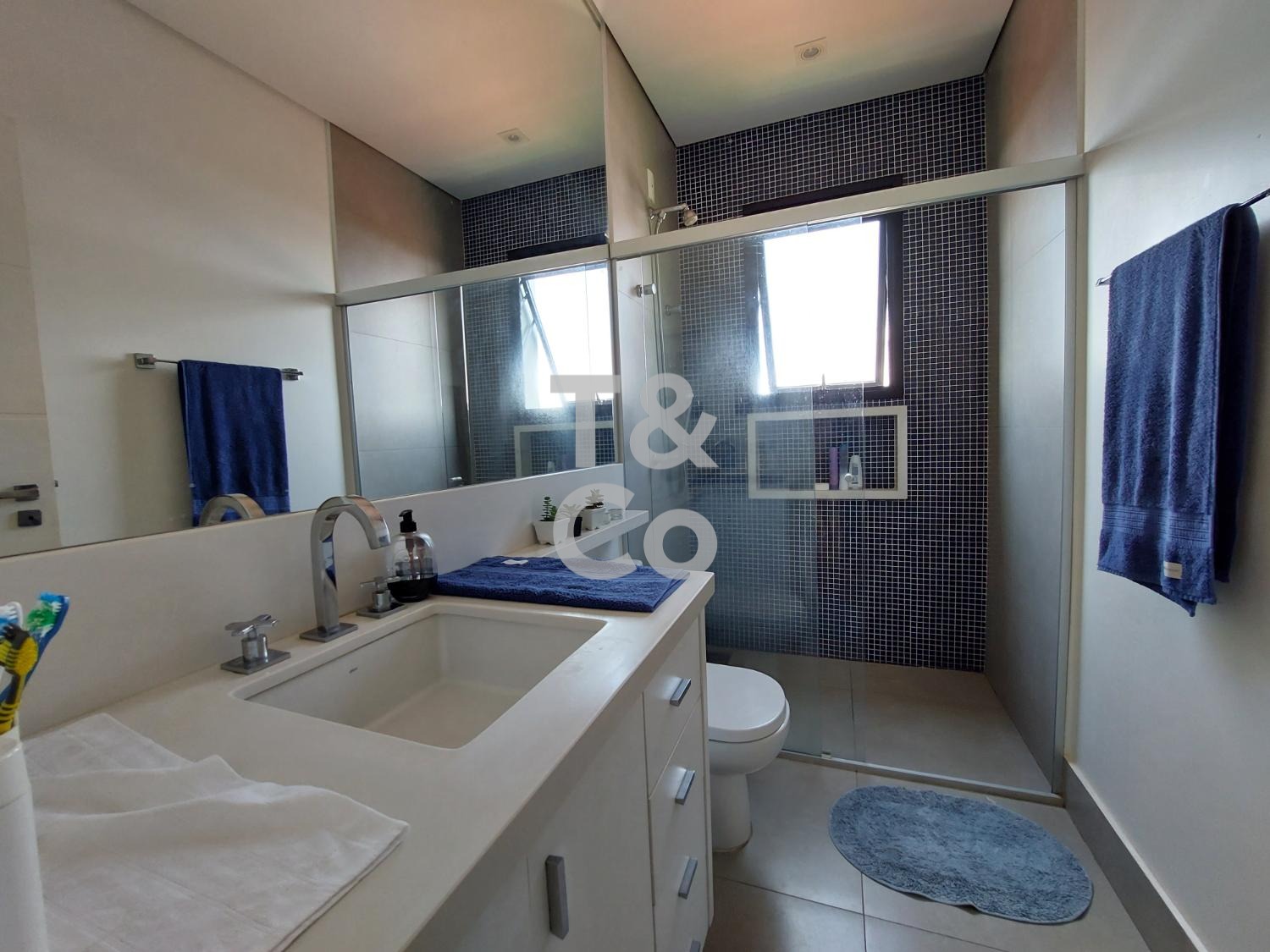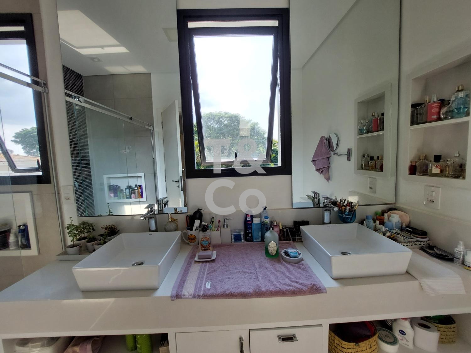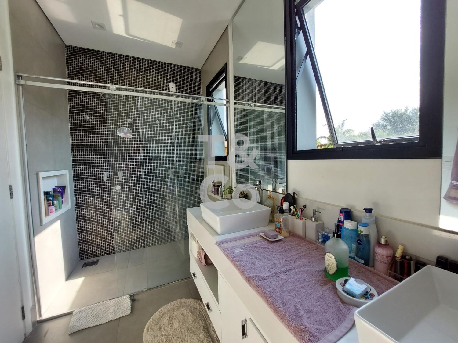 No pavimento superior estão os espaços íntimos: a suíte máster conta com escritório, closet e sacada com vista permanente para a mata. Há ainda uma segunda suíte com sacada e mais dois dormitórios atendidos por um banheiro social. Todos os dormitórios possuem persianas motorizadas e aparelhos de ar-condicionado. O imóvel dispõe de aquecimento solar e é rico em armários planejados, oferecendo praticidade e conforto no dia a dia.