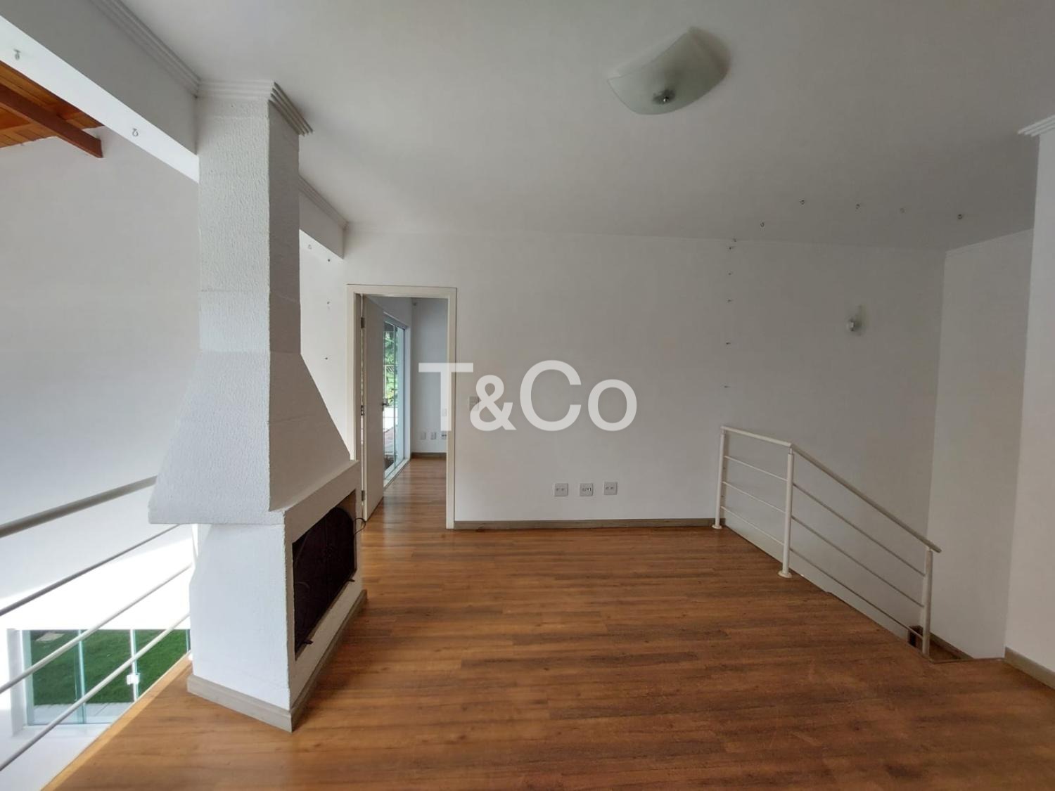 A suíte máster fica no piso superior, junto a sala íntima, com lareira.