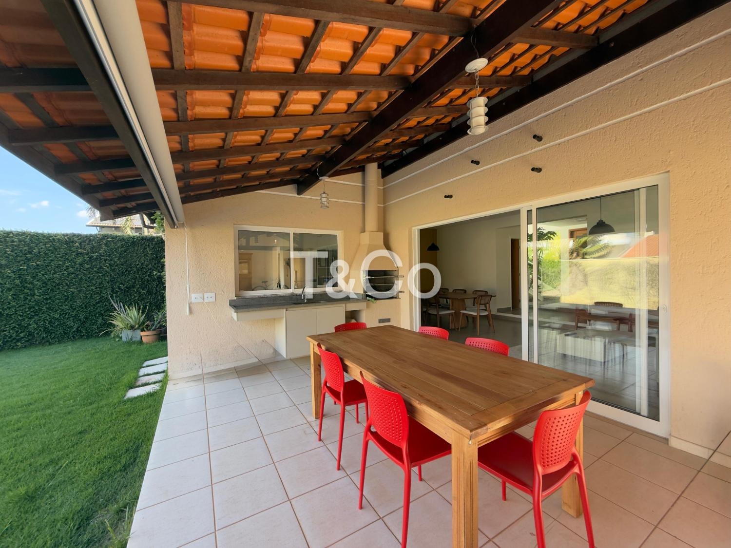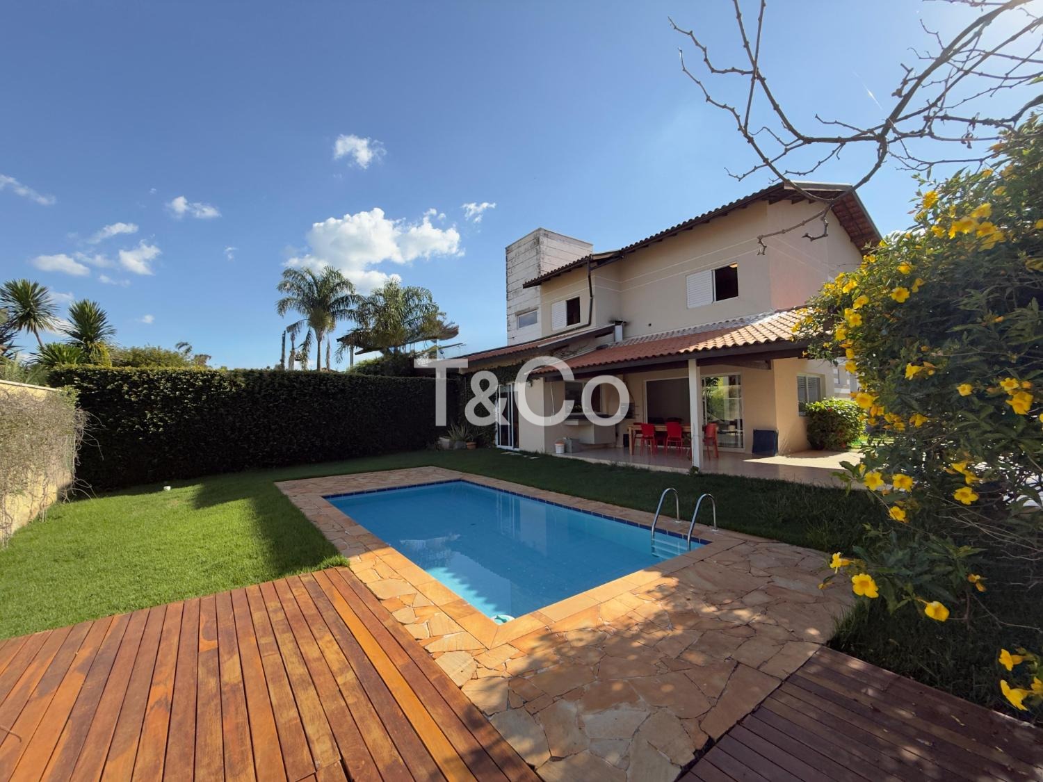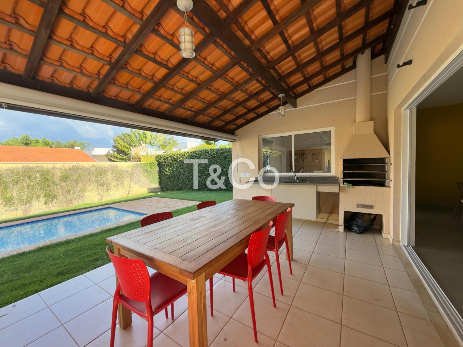 No piso térreo, o imóvel conta com sala para dois ambientes, cozinha planejada, área de serviço, sala de TV, banheiro e lavabo. A área externa possui espaço gourmet com churrasqueira, piscina e quintal gramado, com integração entre os ambientes.