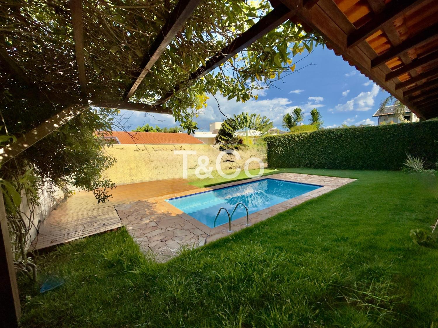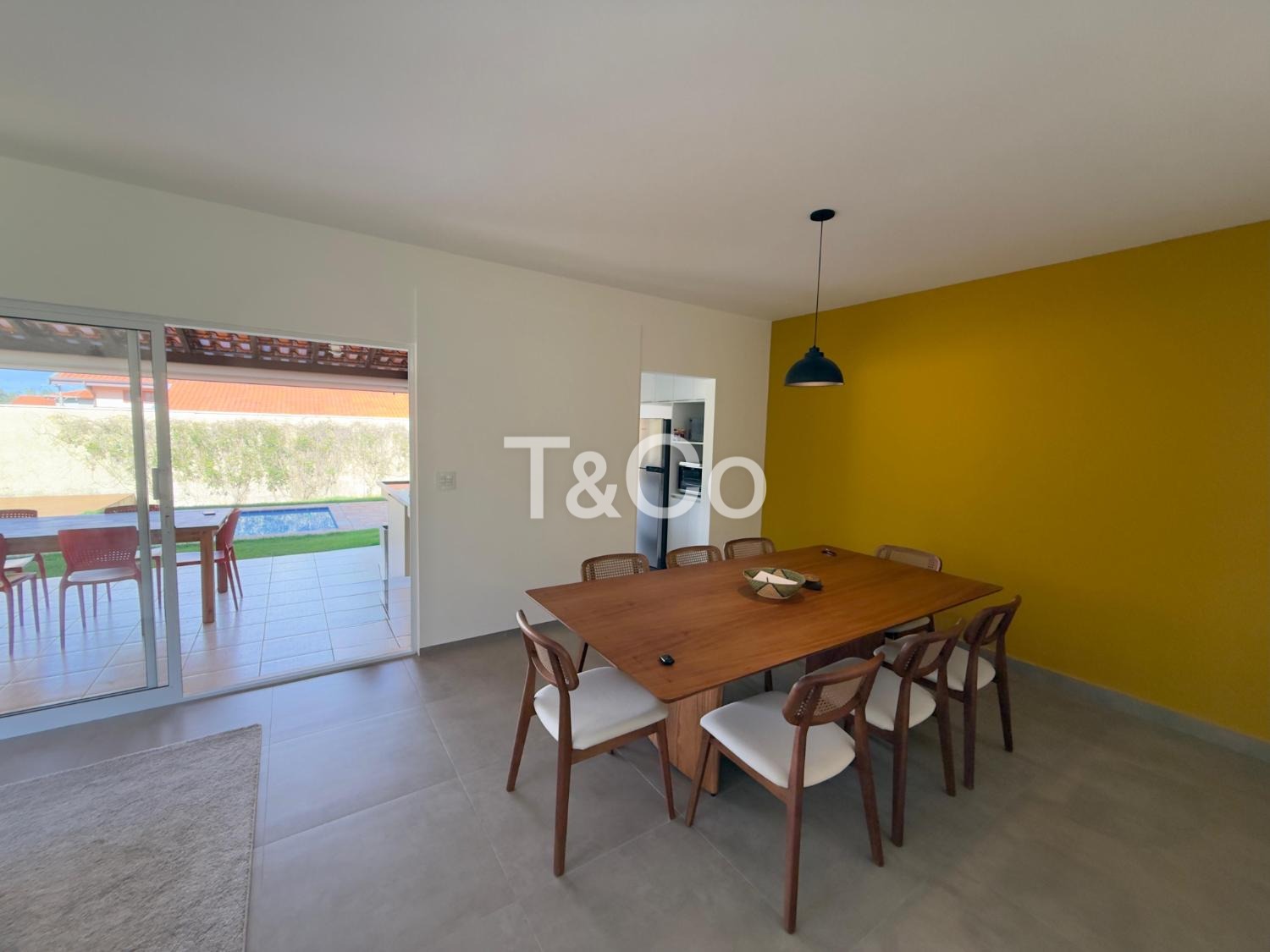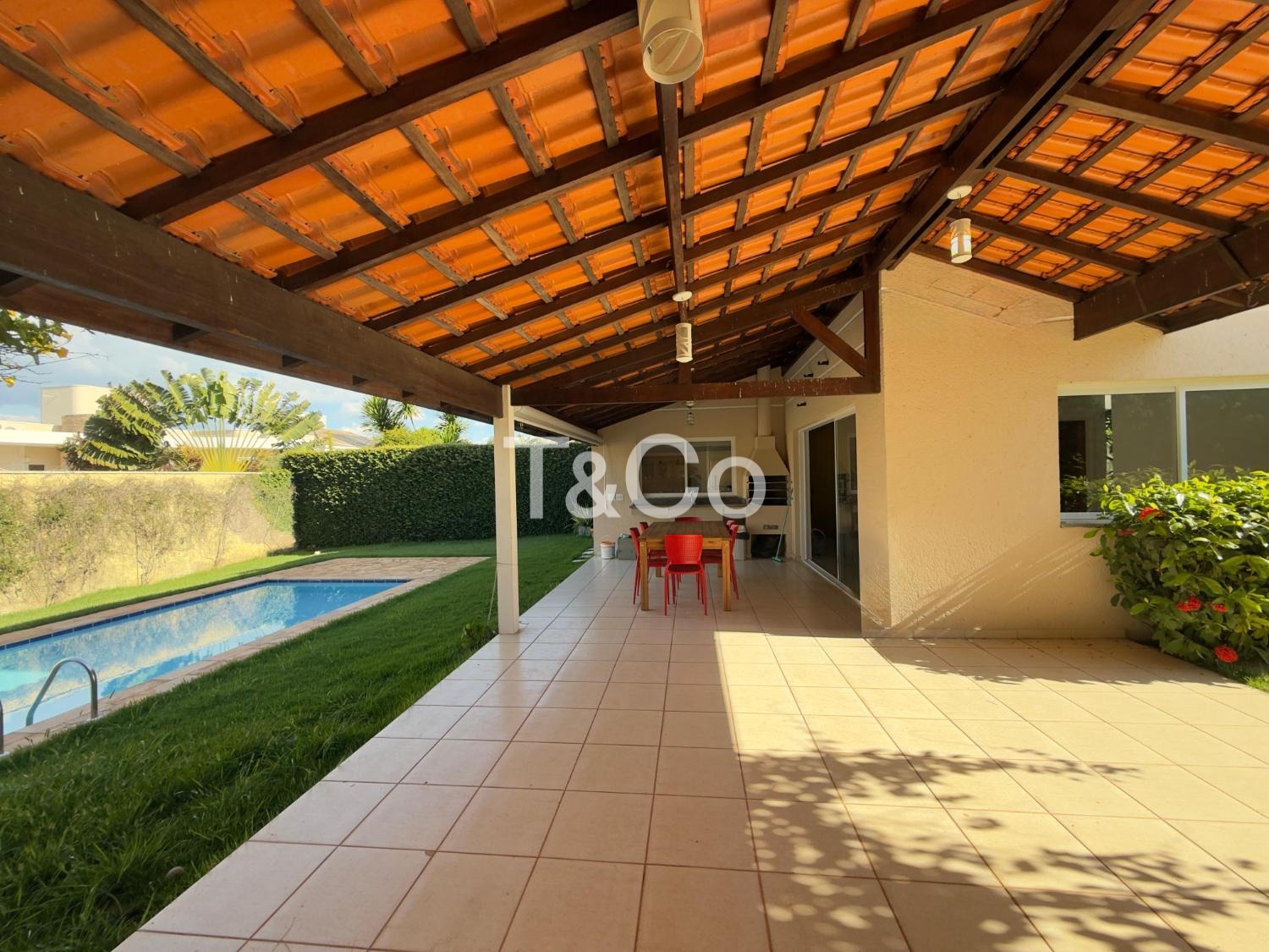 No piso térreo, o imóvel conta com sala para dois ambientes, cozinha planejada, área de serviço, sala de TV, banheiro e lavabo. A área externa possui espaço gourmet com churrasqueira, piscina e quintal gramado, com integração entre os ambientes.