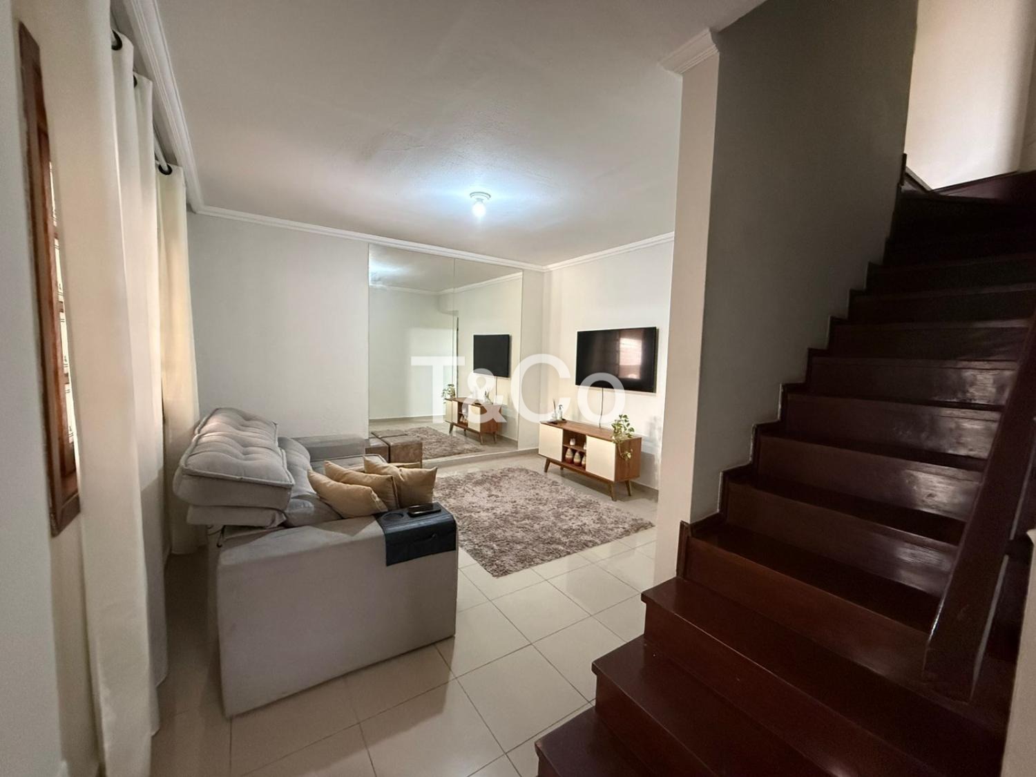 Casa sobrado com 3 quartos sendo uma suíte, sala de estar e jantar, ampla cozinha com armários, área gourmet com churrasqueira à carvão, lavanderia separada, acabamento em gesso, depósito, 2 vagas de garagem coberta, banheiro social com box blindex, ar condicionado, quintal privativo