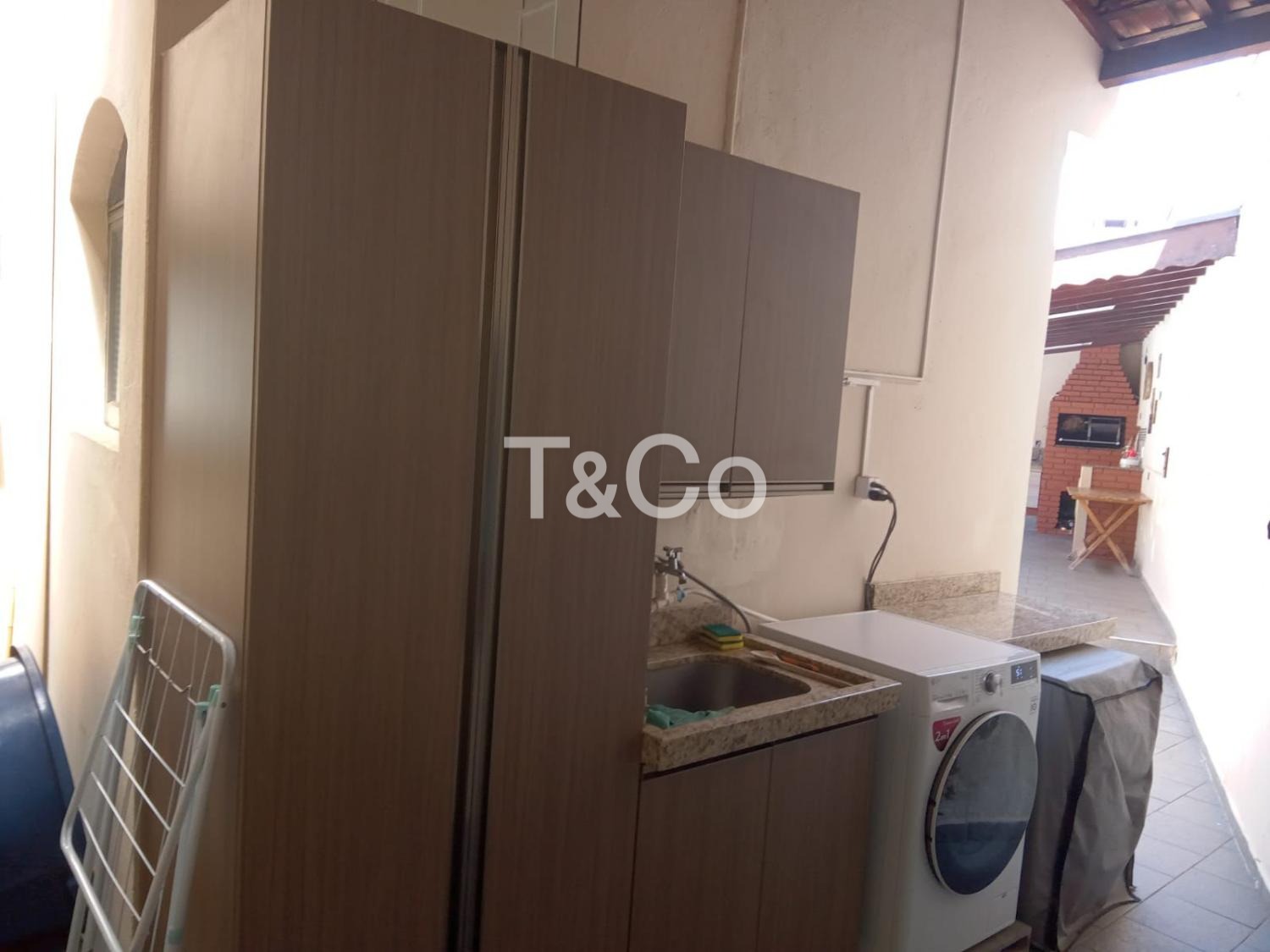 Na área do fundo, uma churrasqueira com cobertura, espaço de apoio com uma sala e um ws externo.