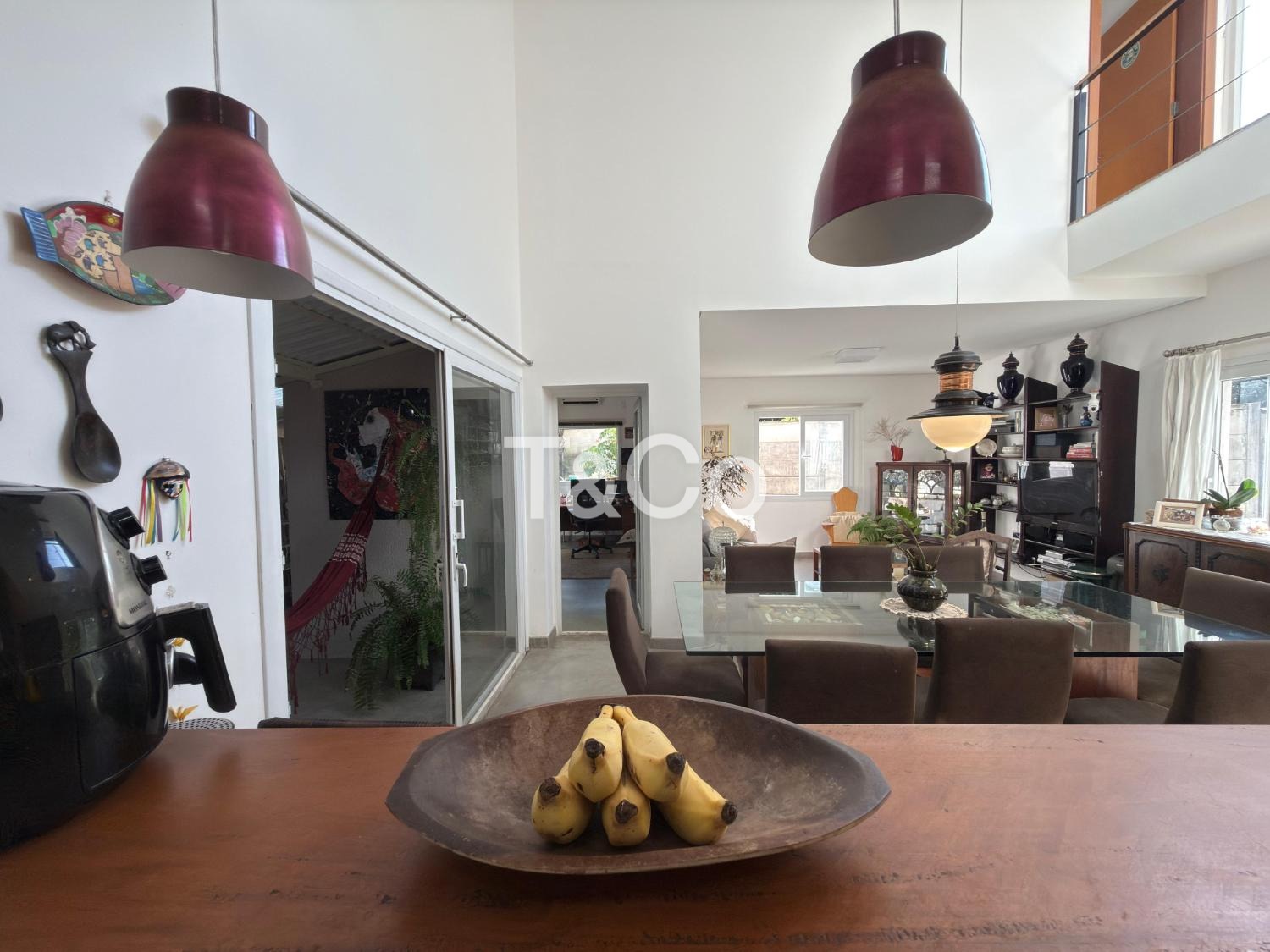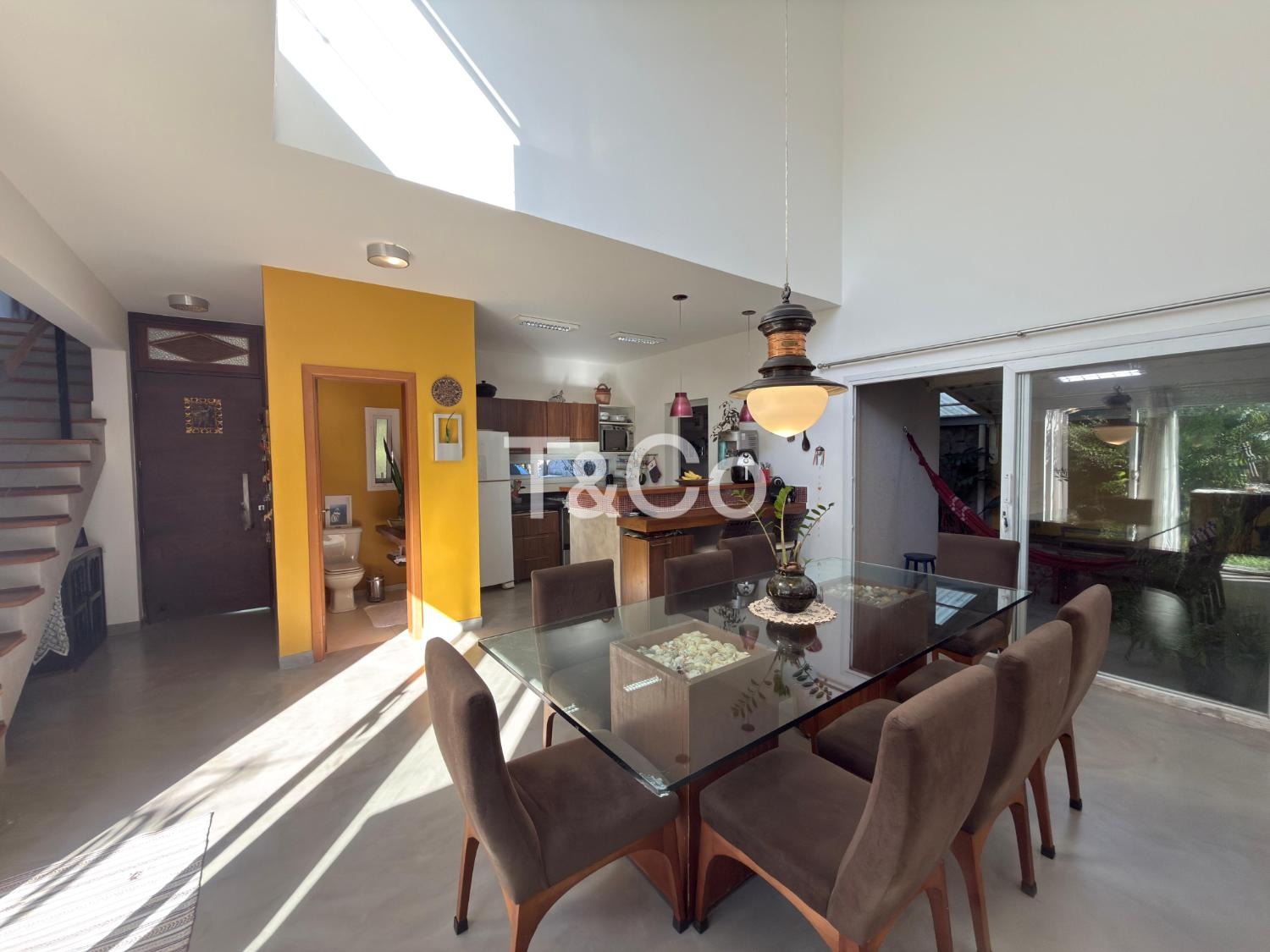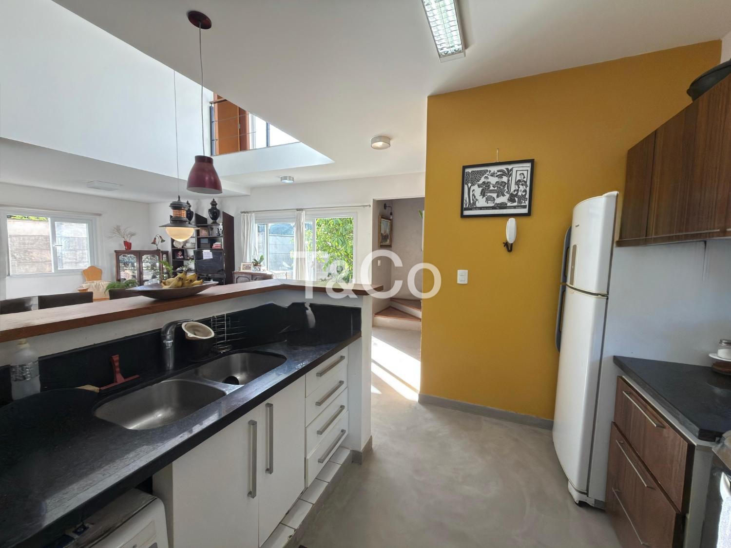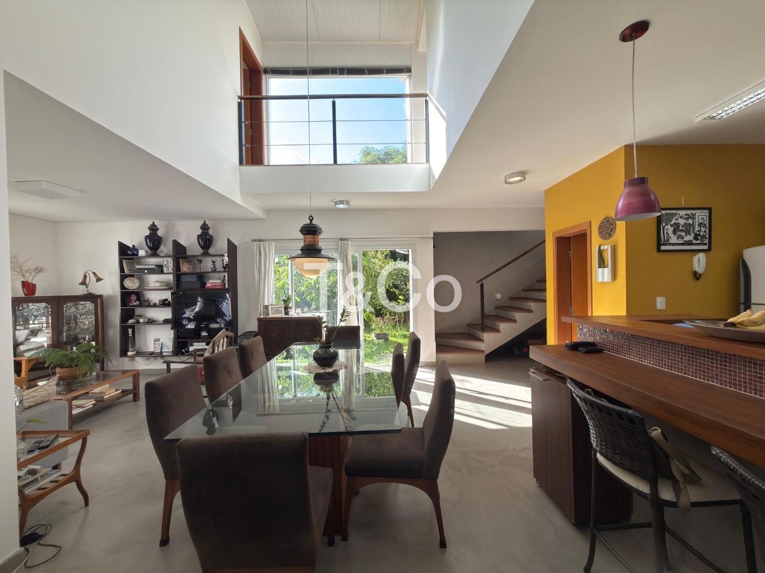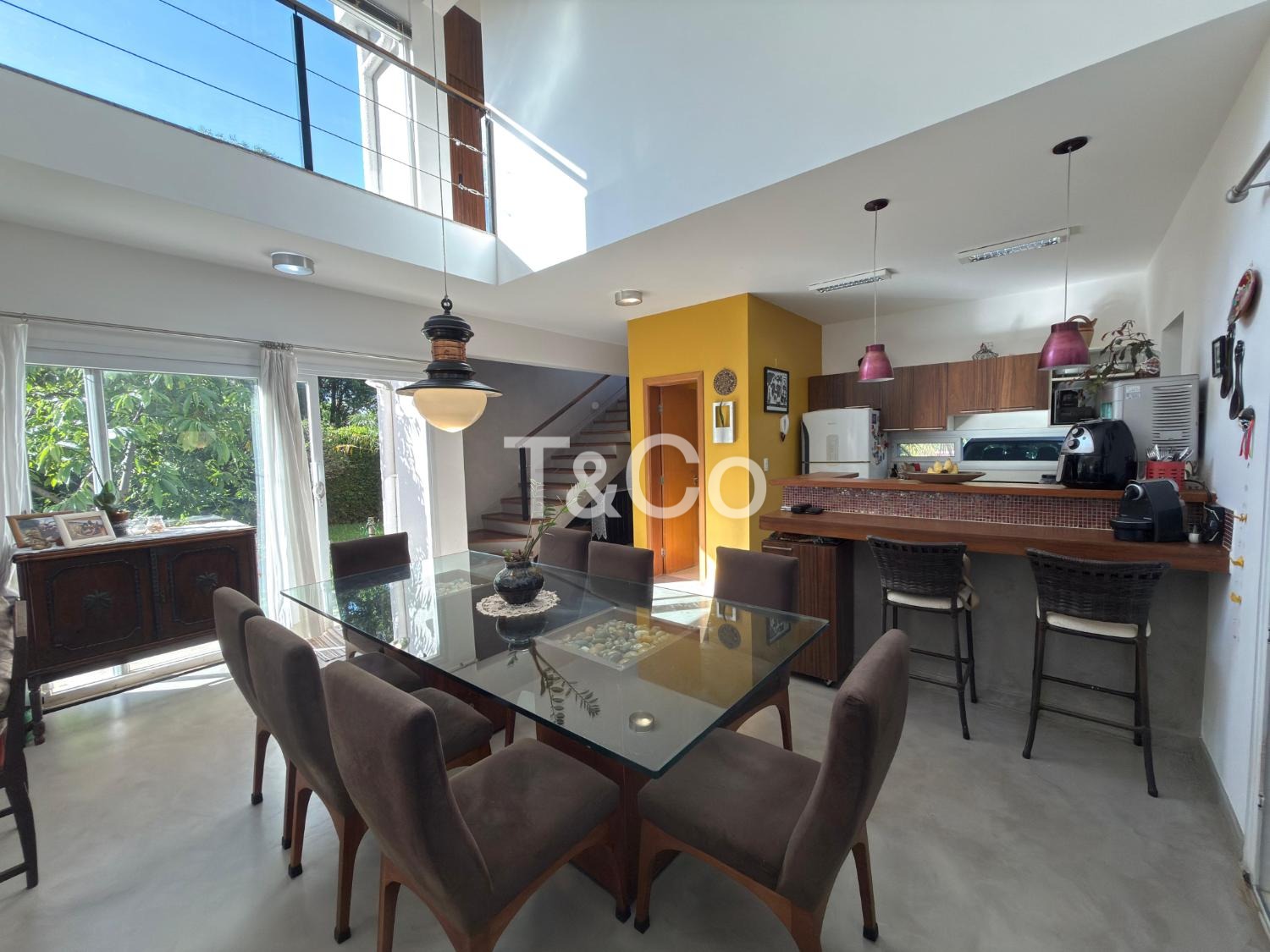 Sala para dois ambientes, com pé direito duplo, integrada à cozinha americana.