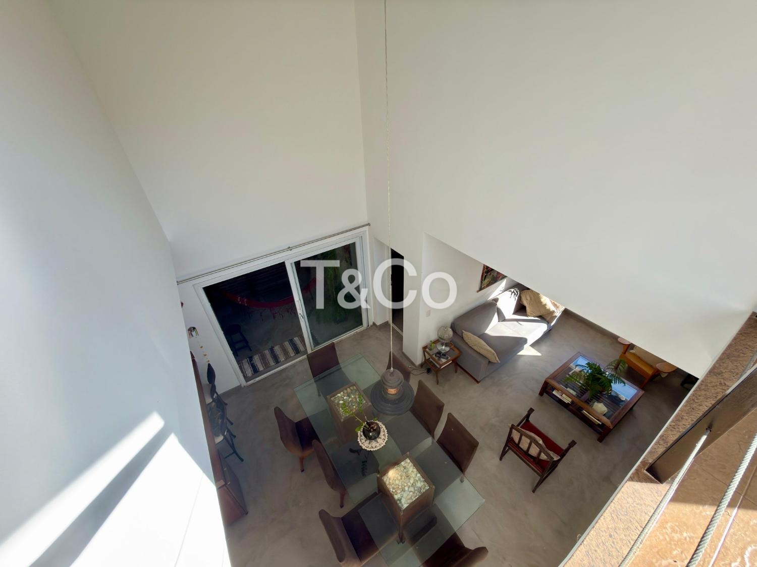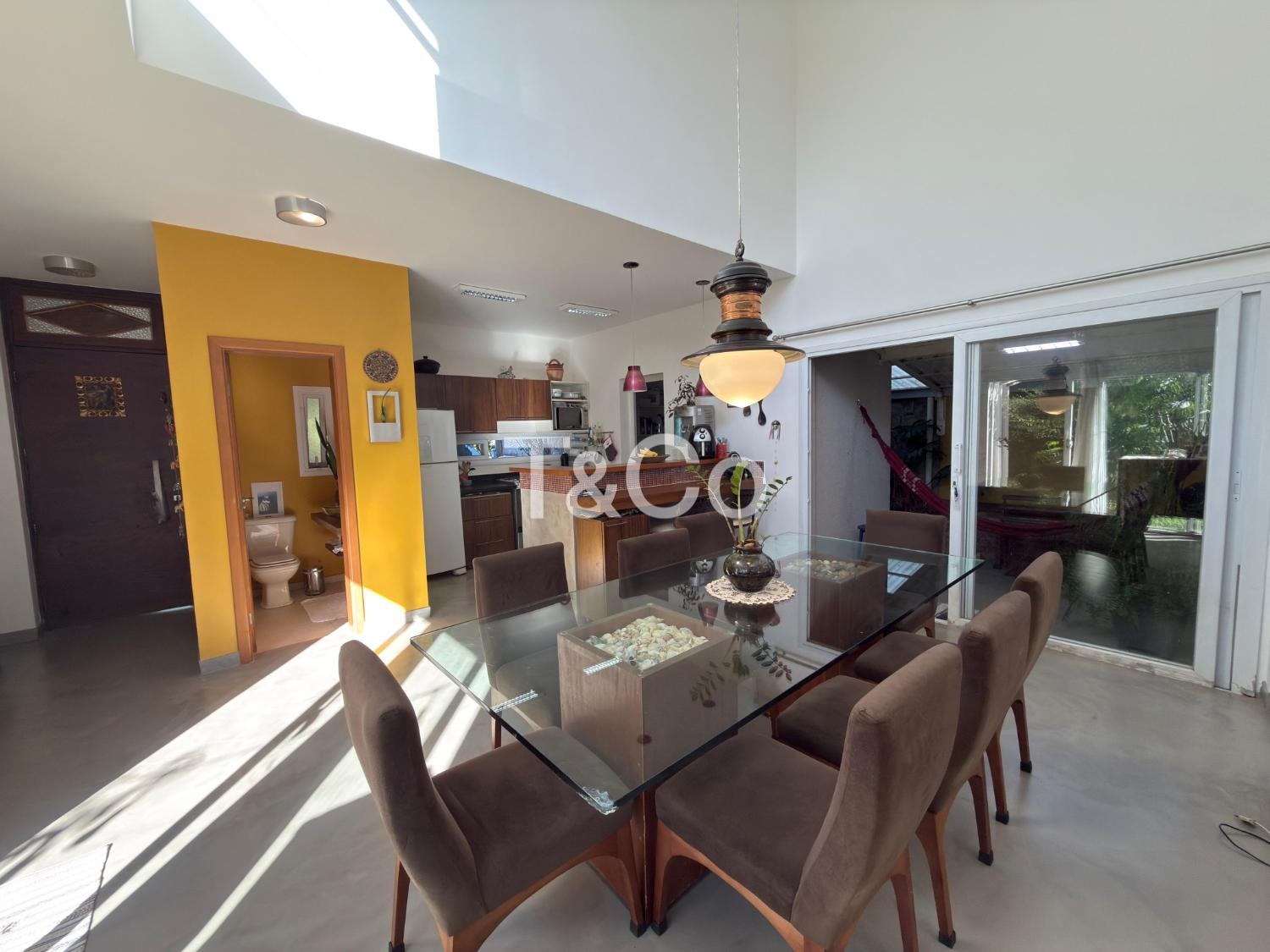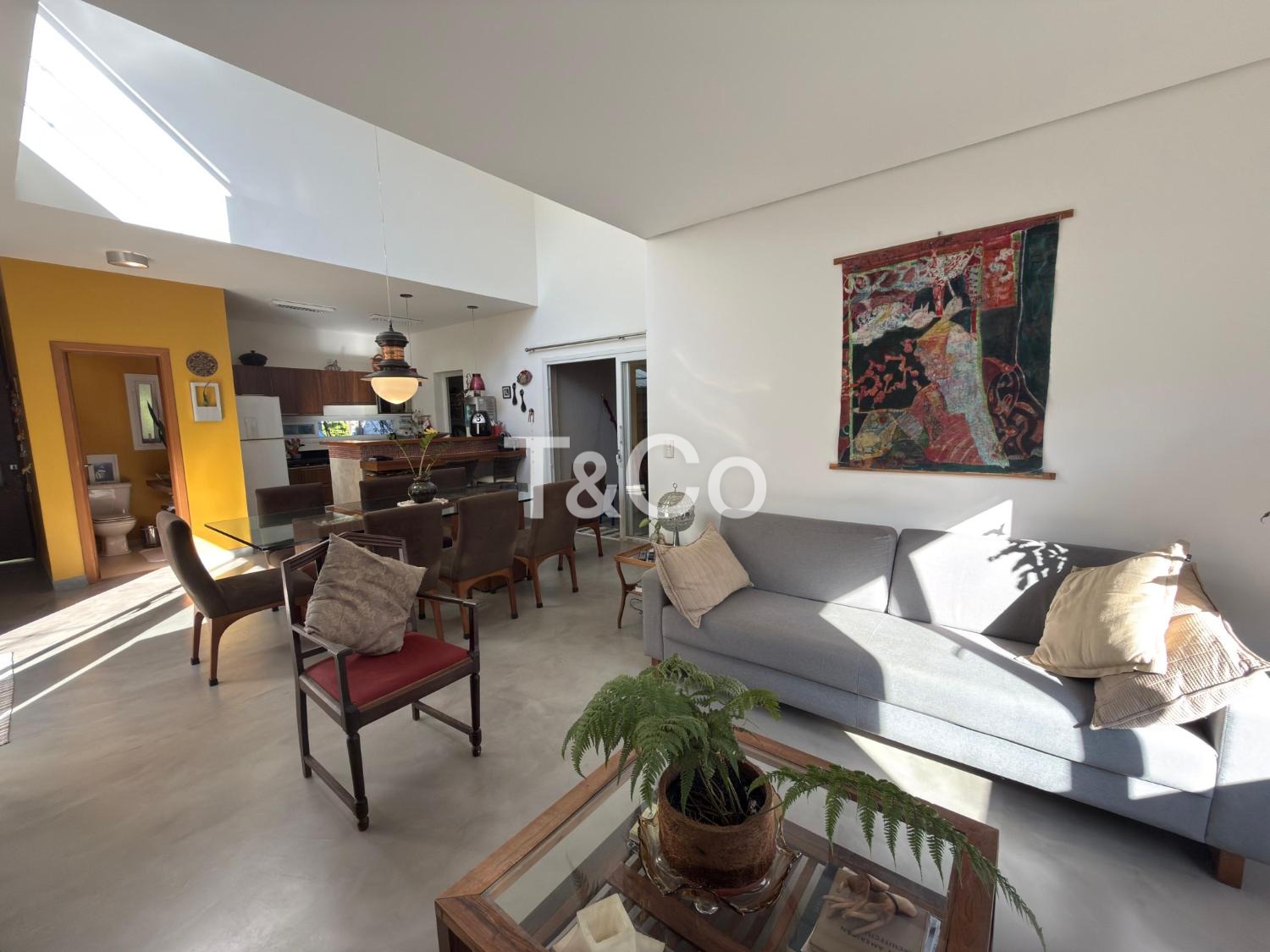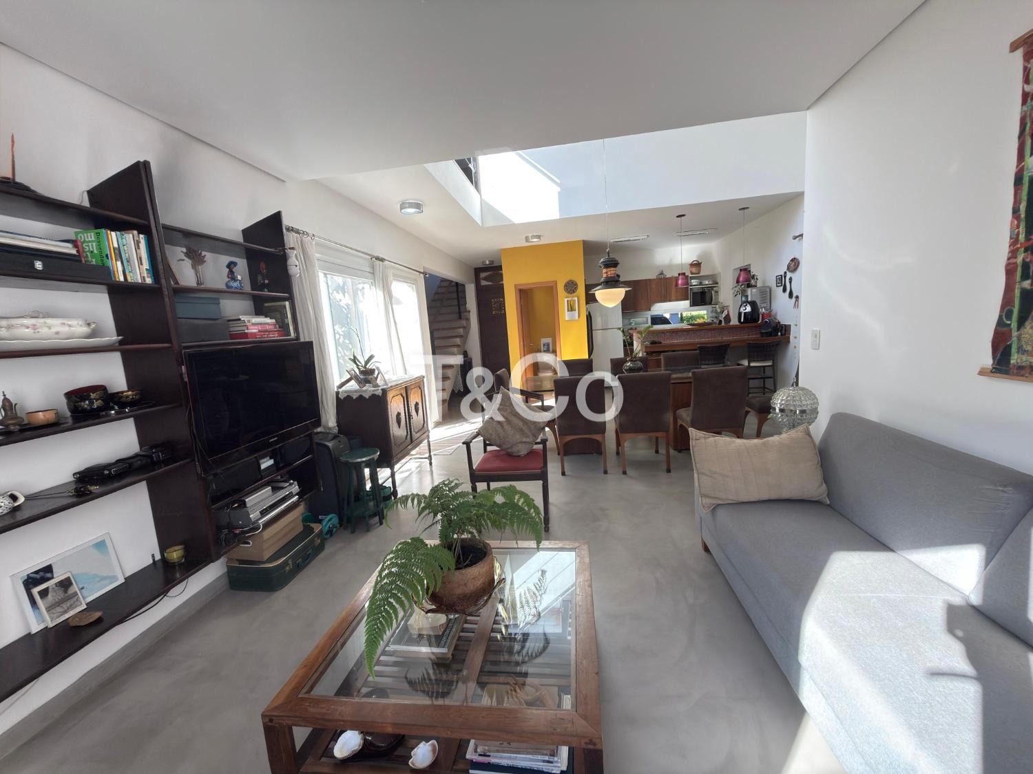 Sala para dois ambientes, com pé direito duplo, integrada à cozinha americana.