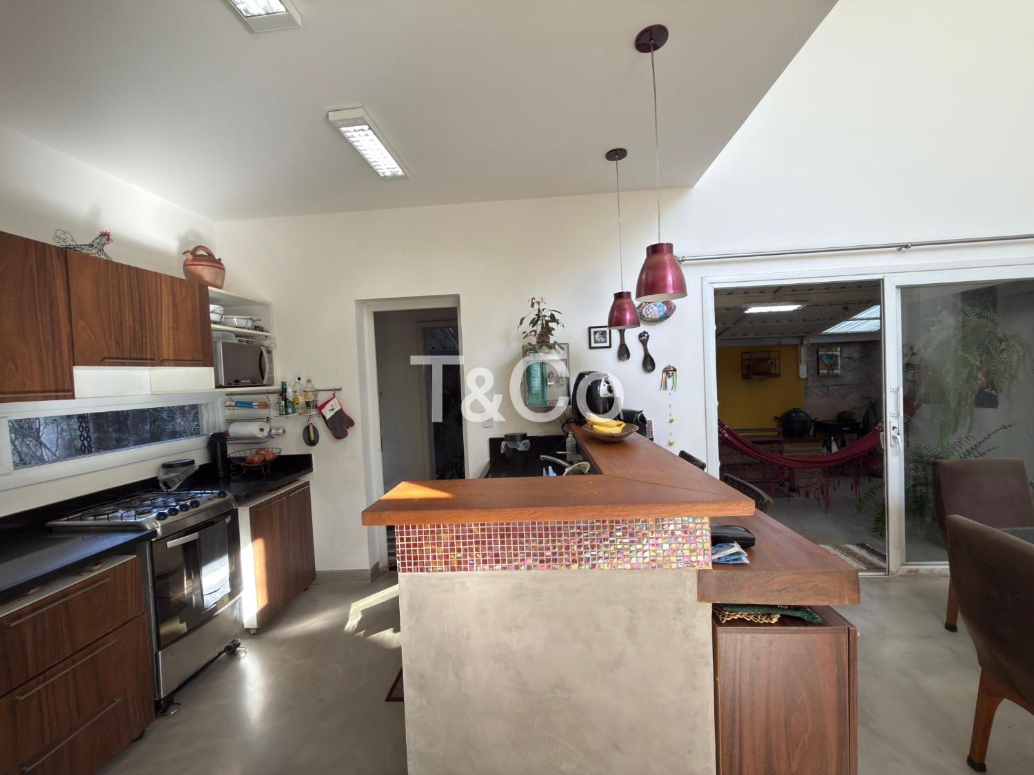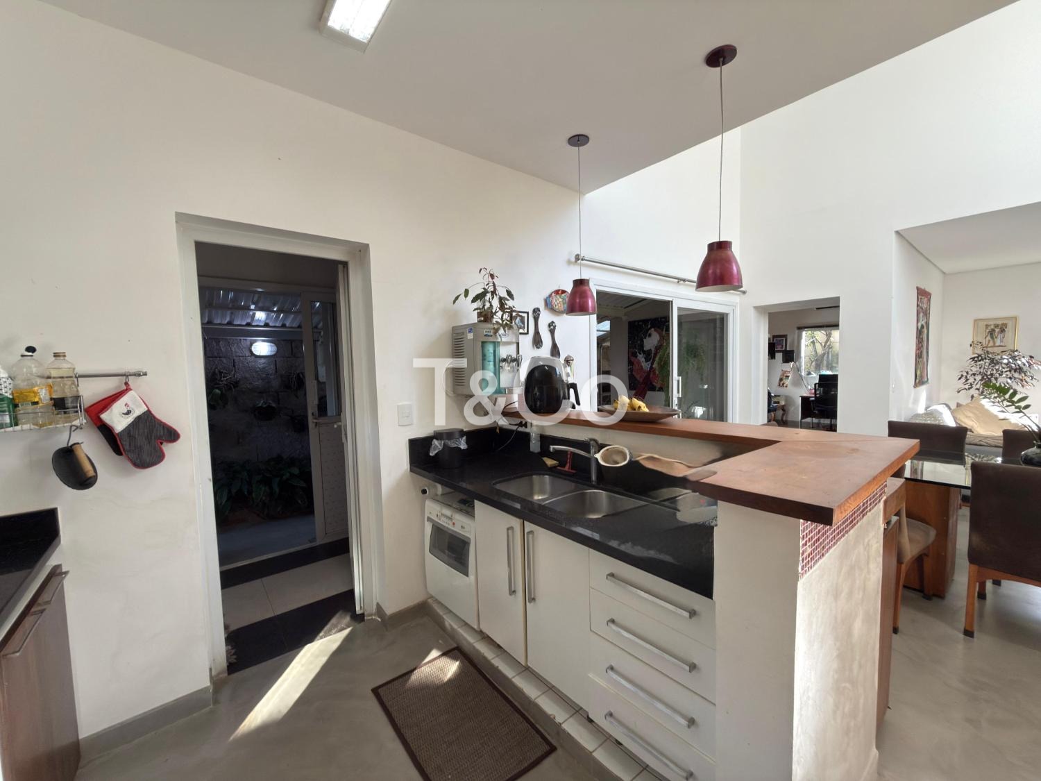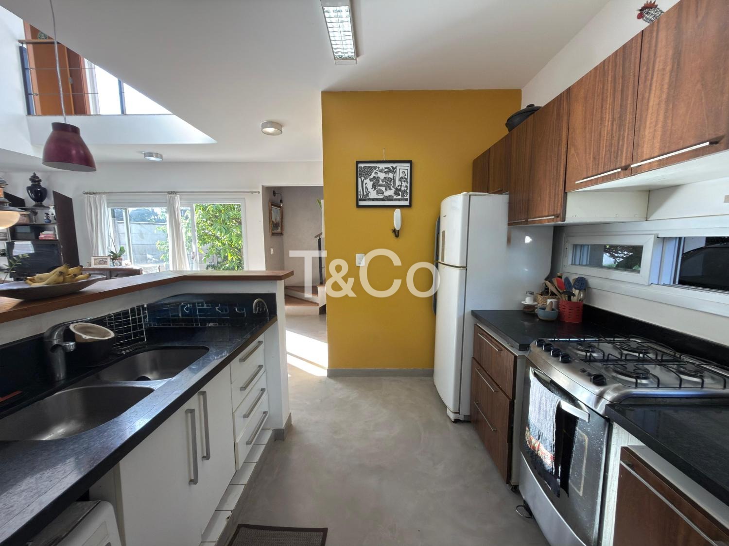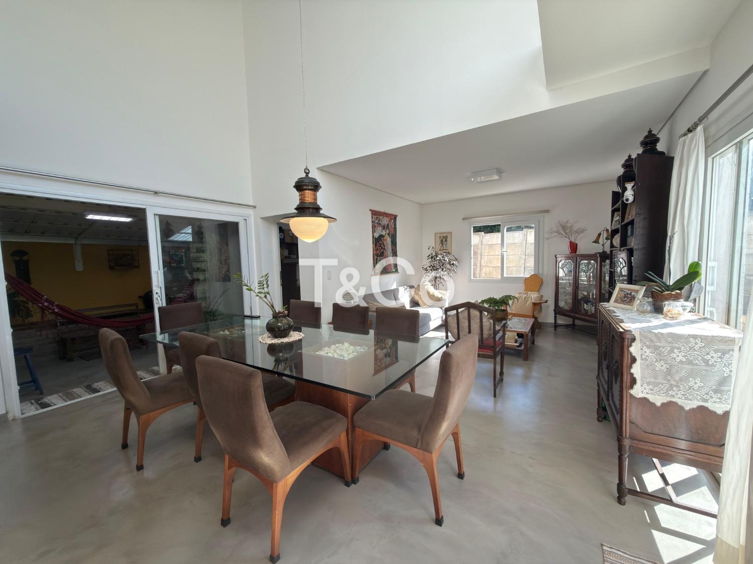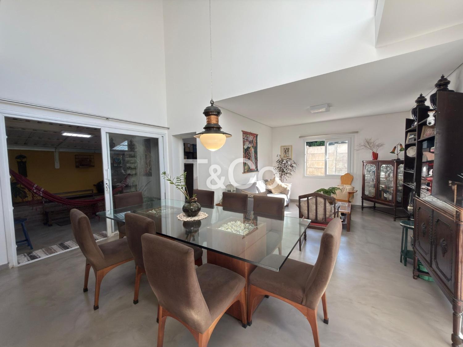 Sala para dois ambientes, com pé direito duplo, integrada à cozinha americana.