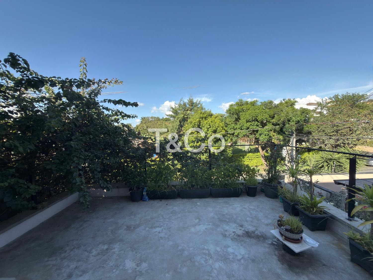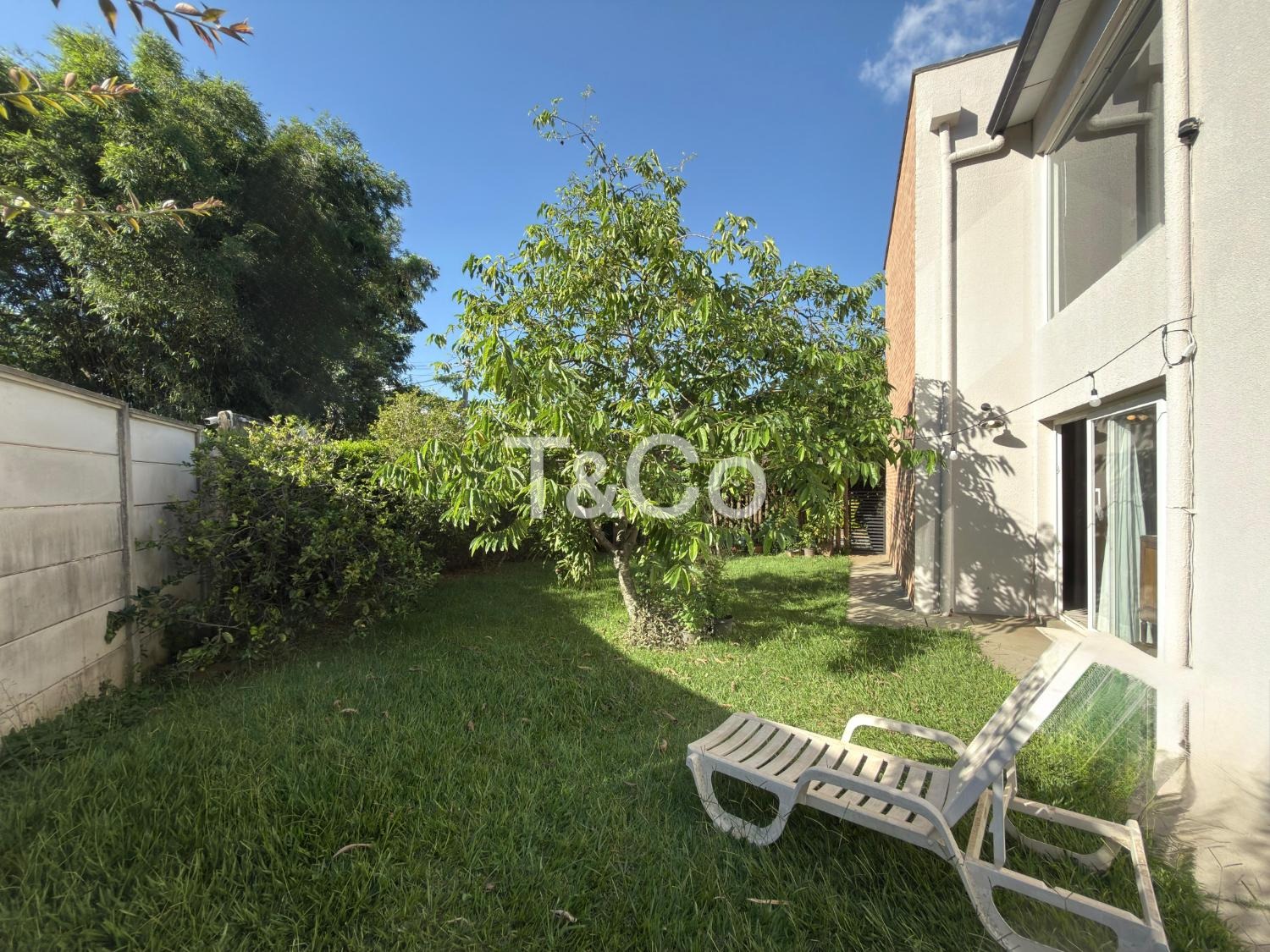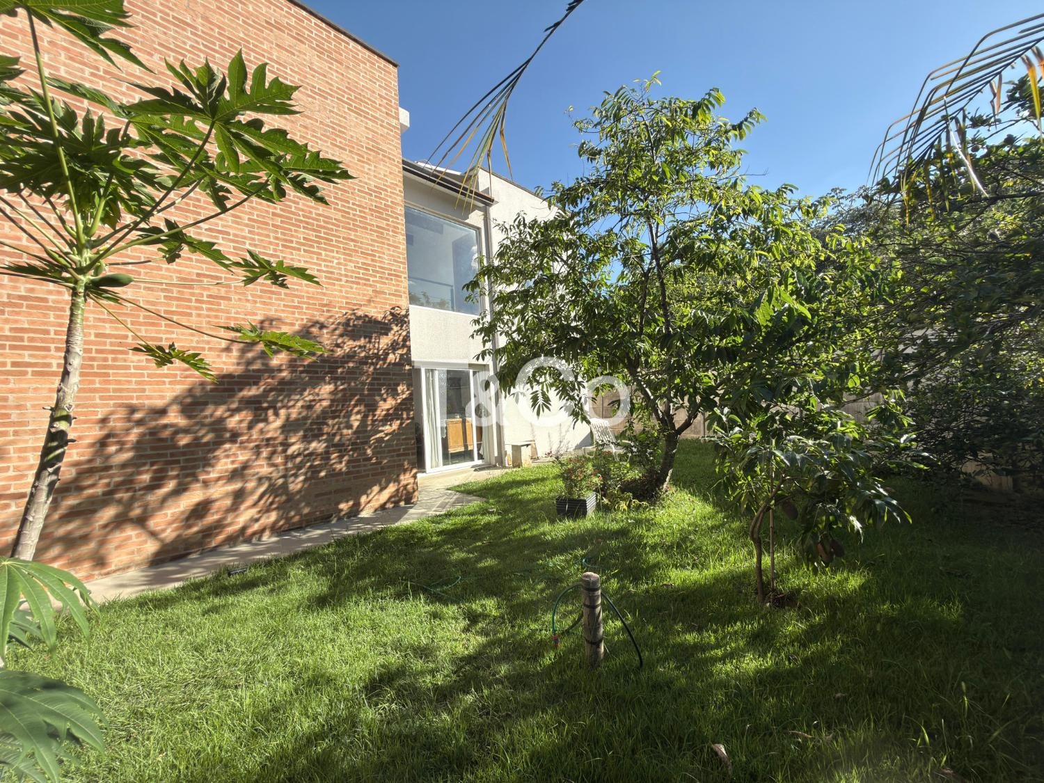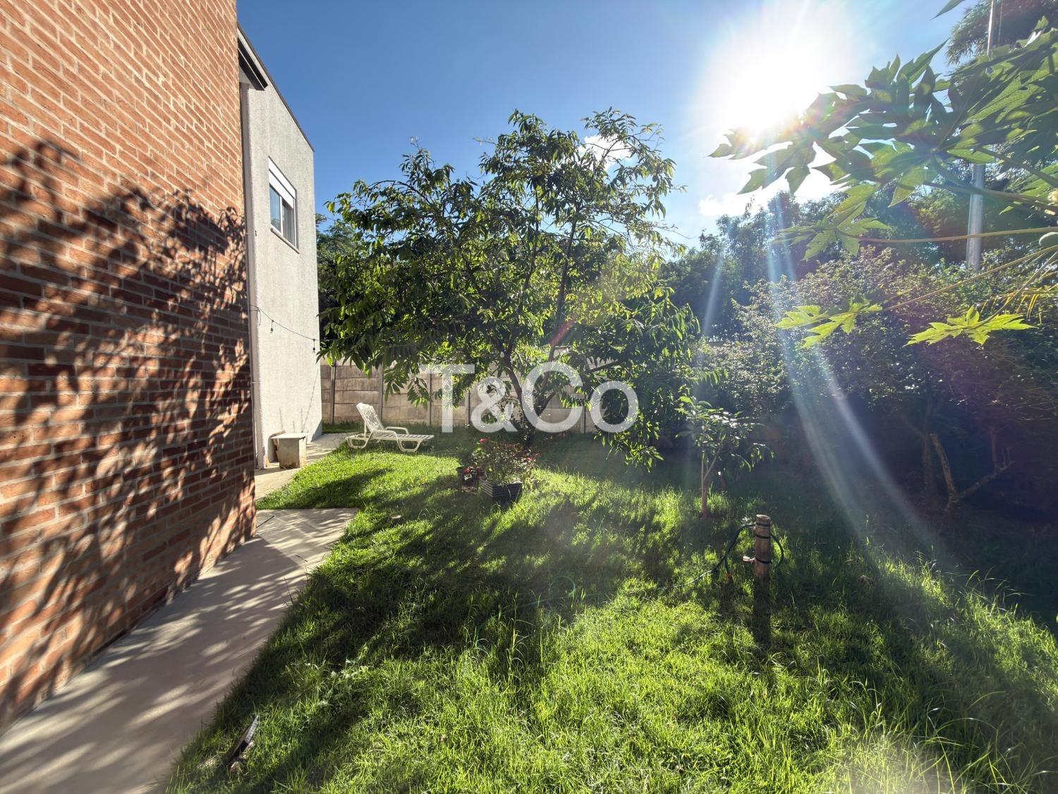 Quintal gramado com árvores frutíferas.