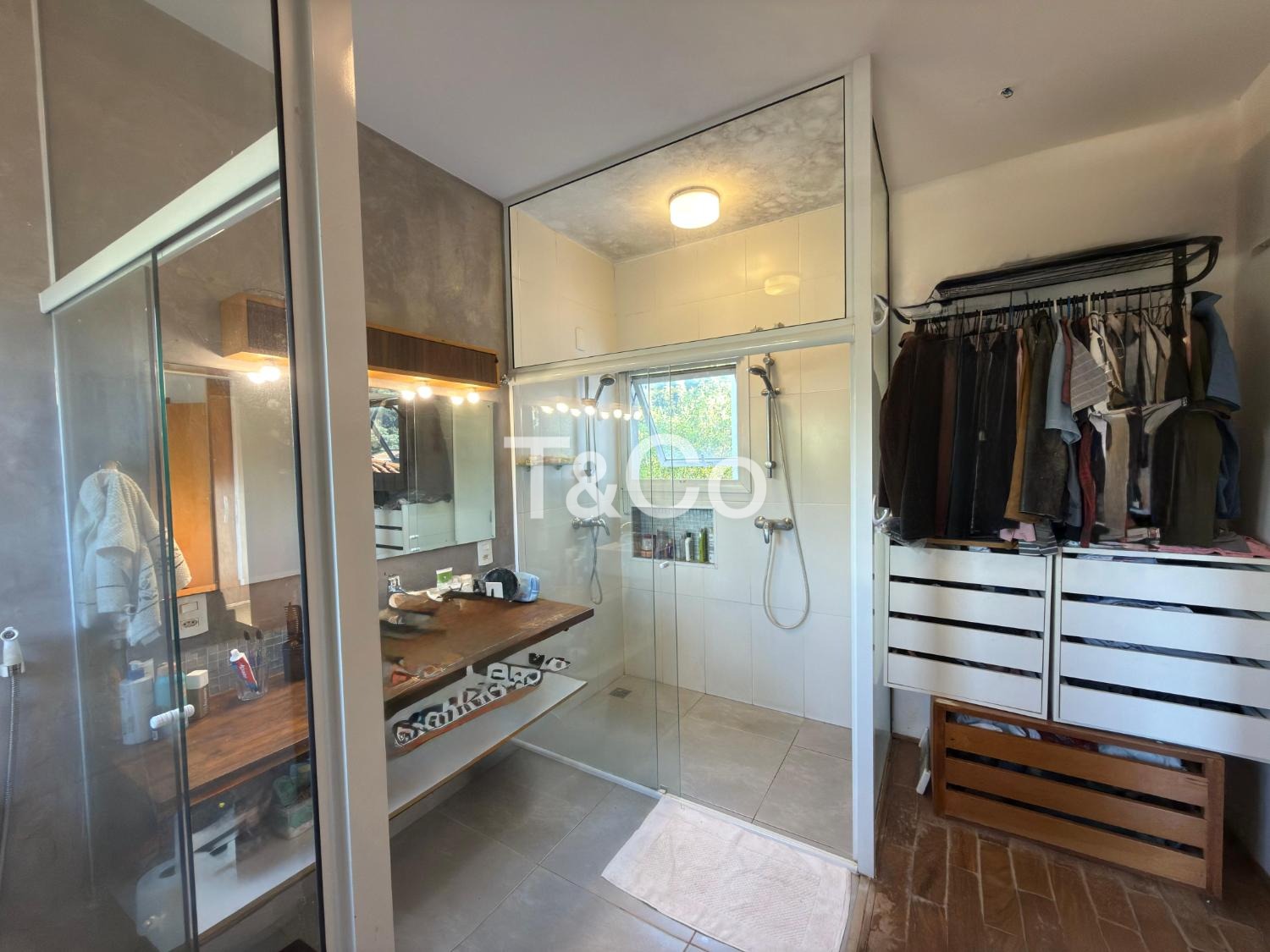 Casa contemporânea com detalhes rústicos, localizada no loteamento Caminhos de San Conrado, em Sousas, Campinas, com ambientes bem distribuídos em dois pavimentos e projeto que valoriza iluminação natural.