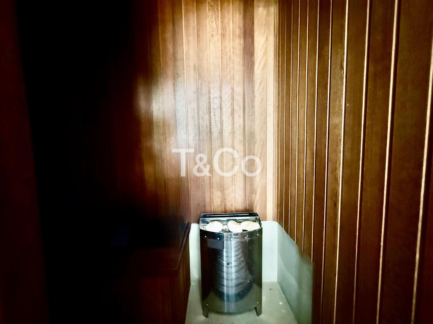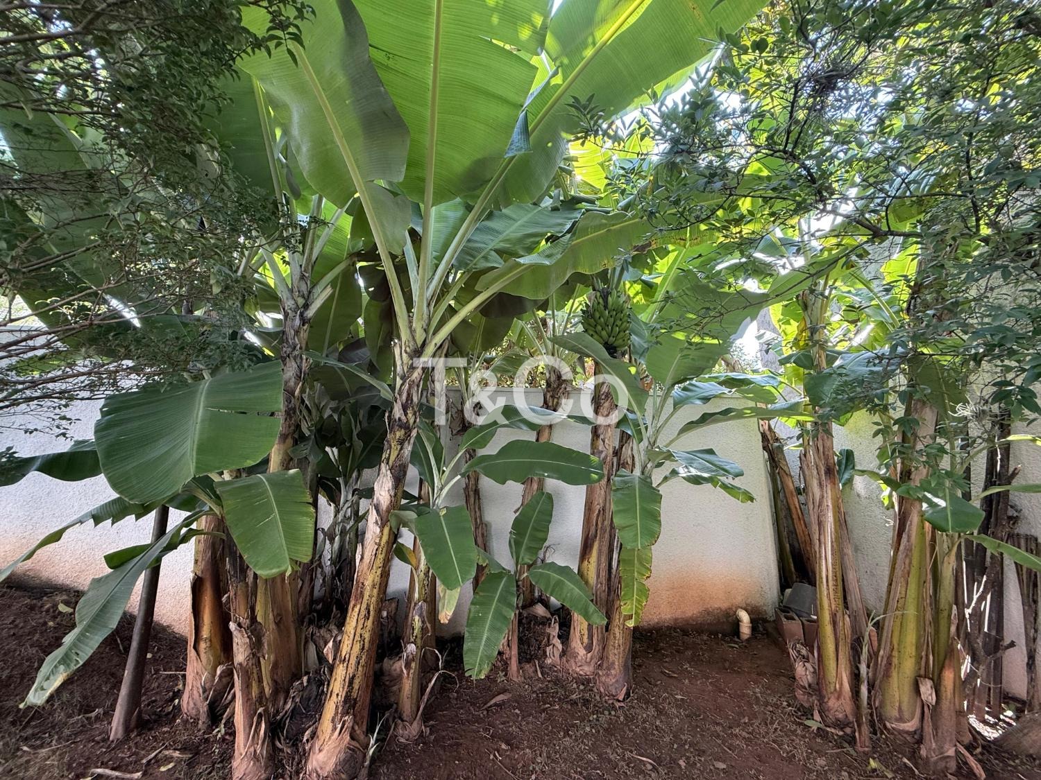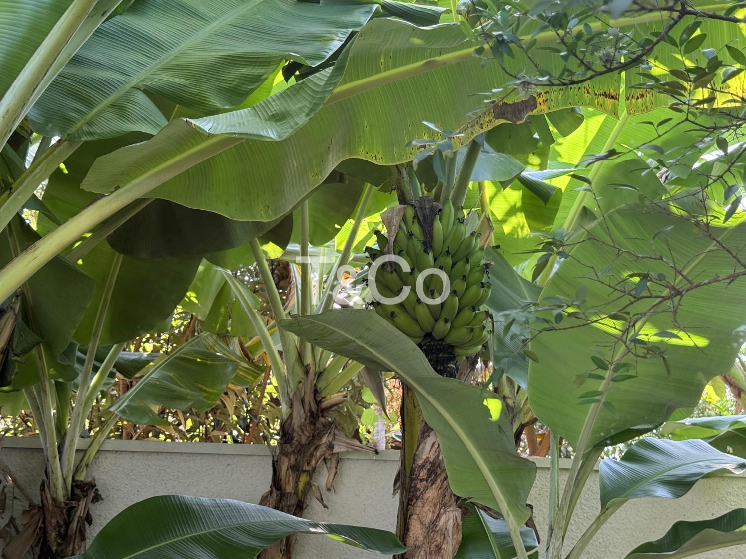 Área externa com piscina, sauna, vestiário, pomar com mexerica, açaí, banana, jabuticaba e coco, além de horta e paisagismo tropical.