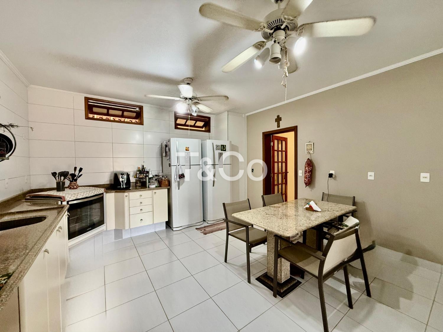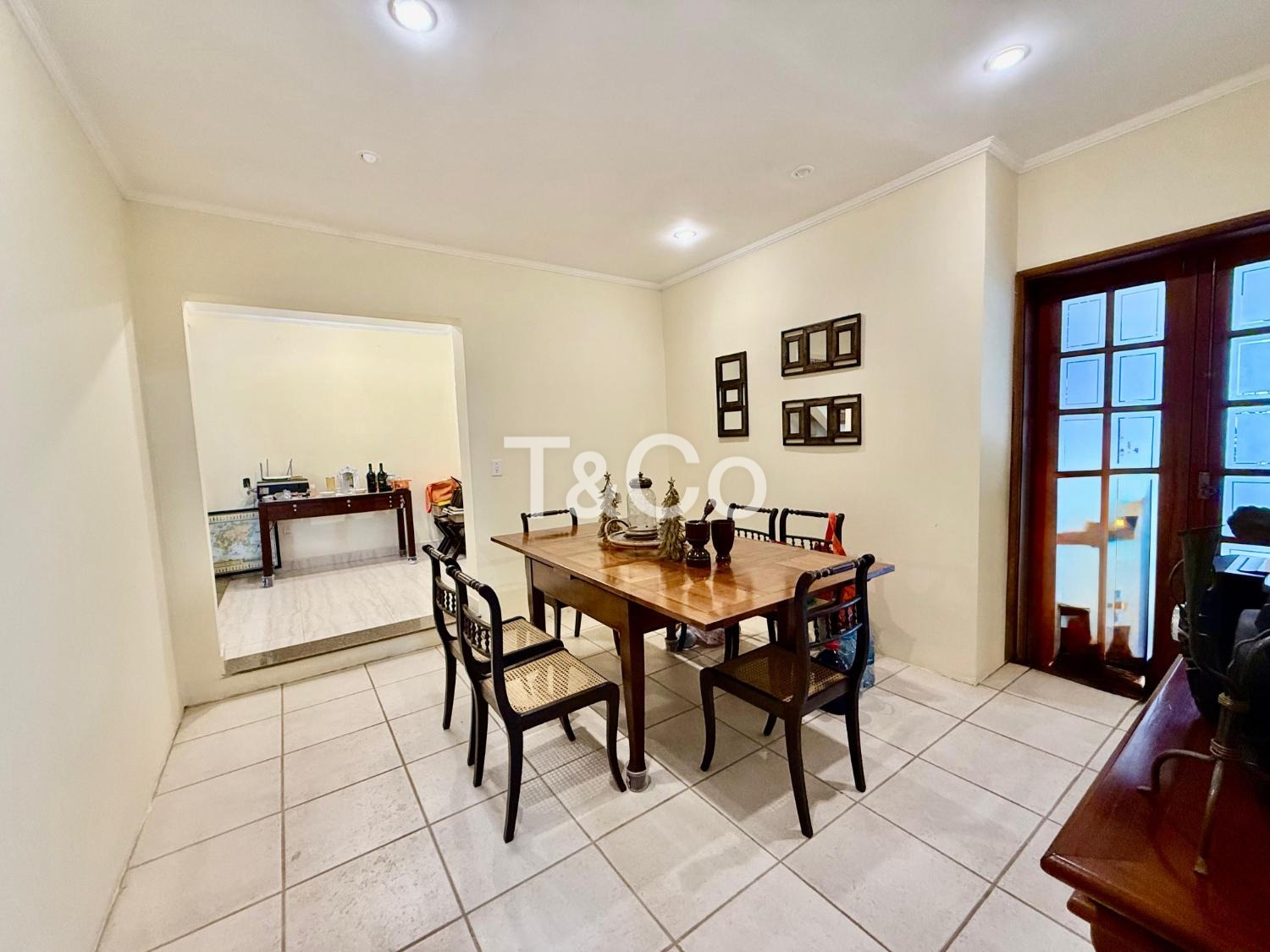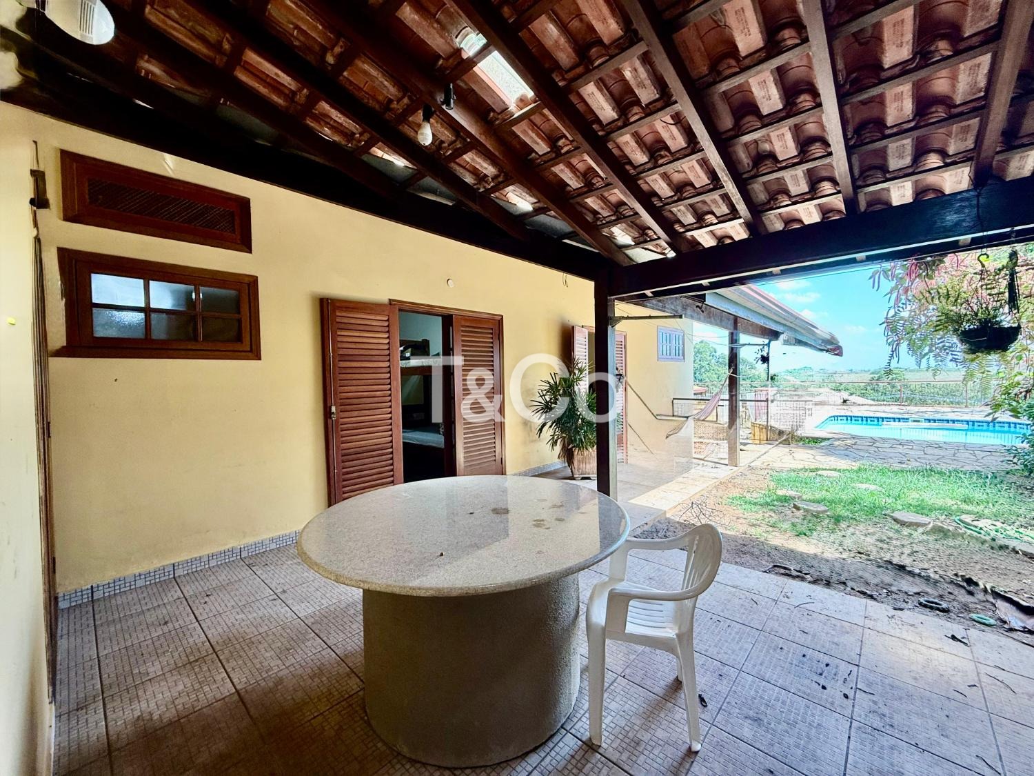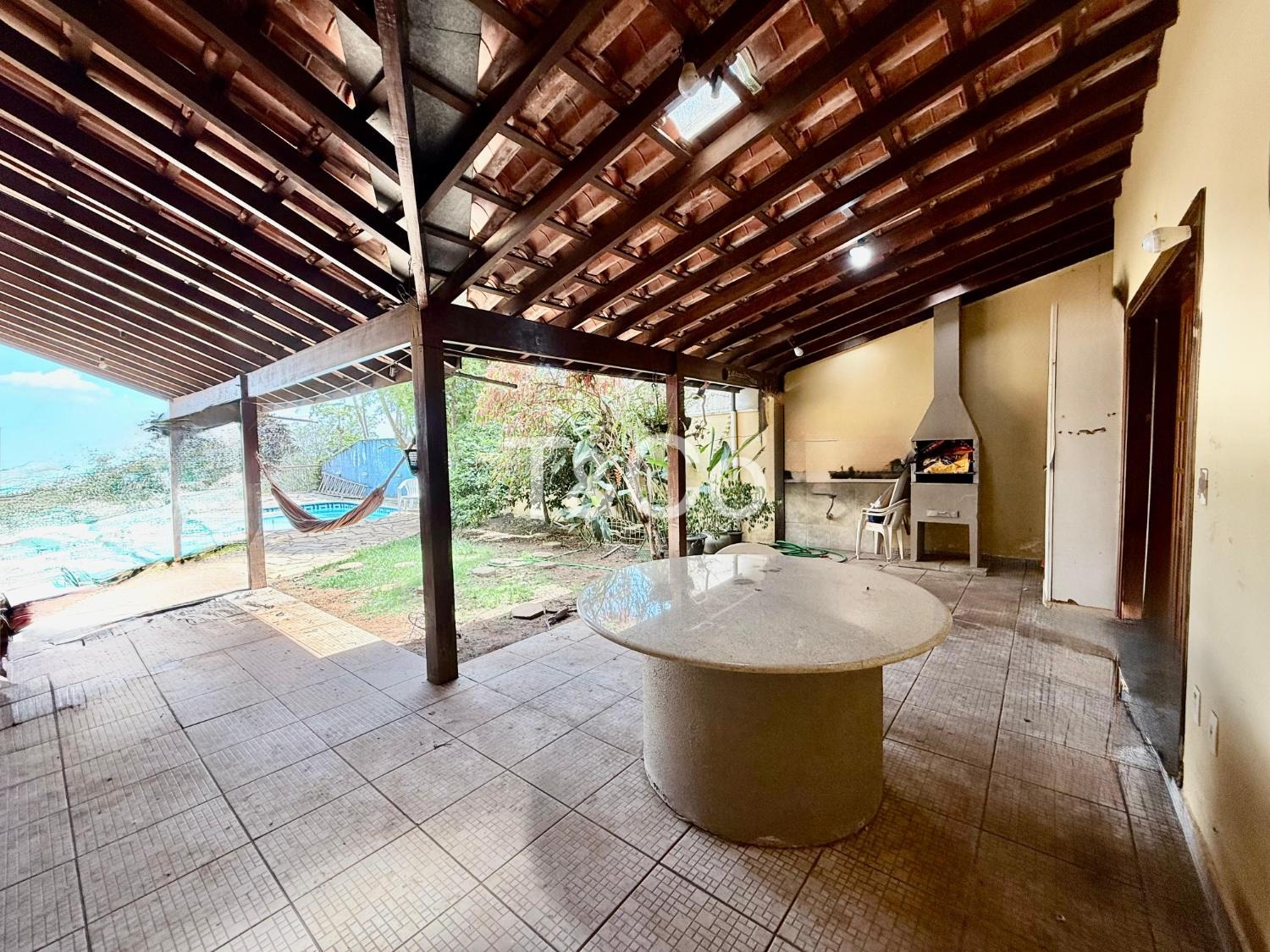 No piso térreo, são 2 suítes, sendo 1 suíte master. Sala com pé-direito alto para 3 ambientes: jantar, estar e TV. Lavabo. Cozinha ampla. Varanda com churrasqueira. Piscina. 2 depósitos.