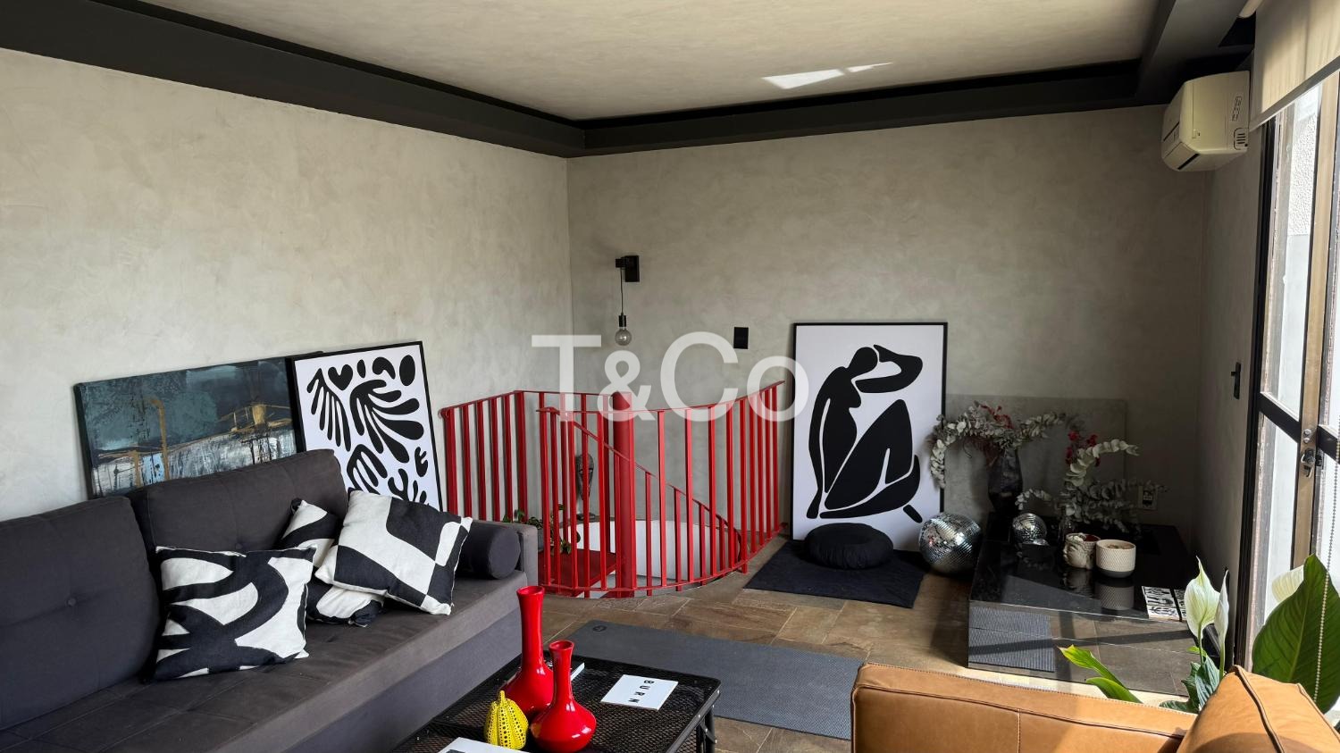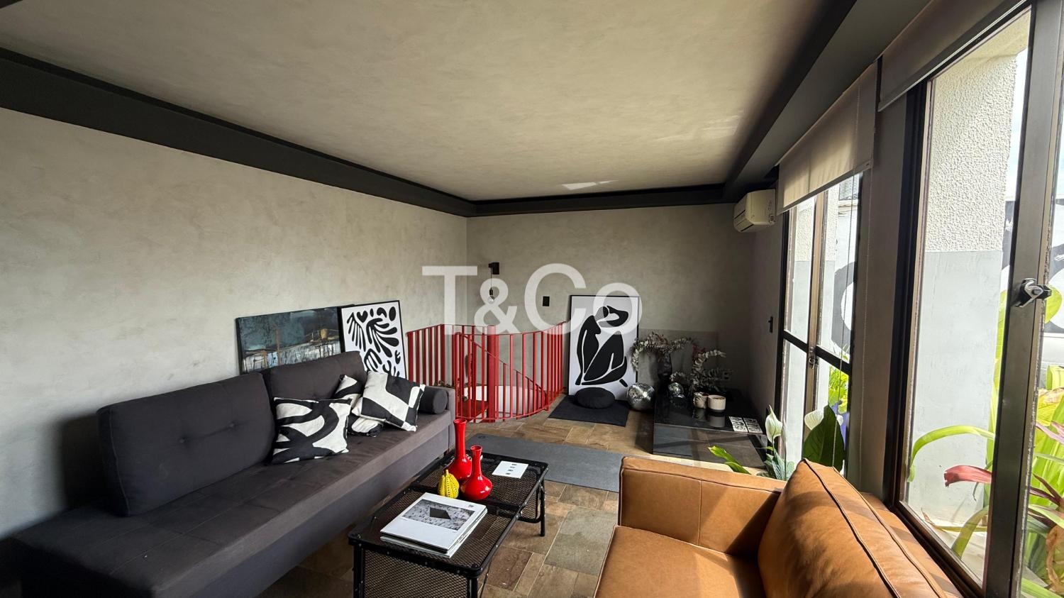 A cobertura exibe um design contemporâneo e sofisticado, com acabamentos de alto padrão. A escada caracol vermelha é um elemento de destaque na área social.
